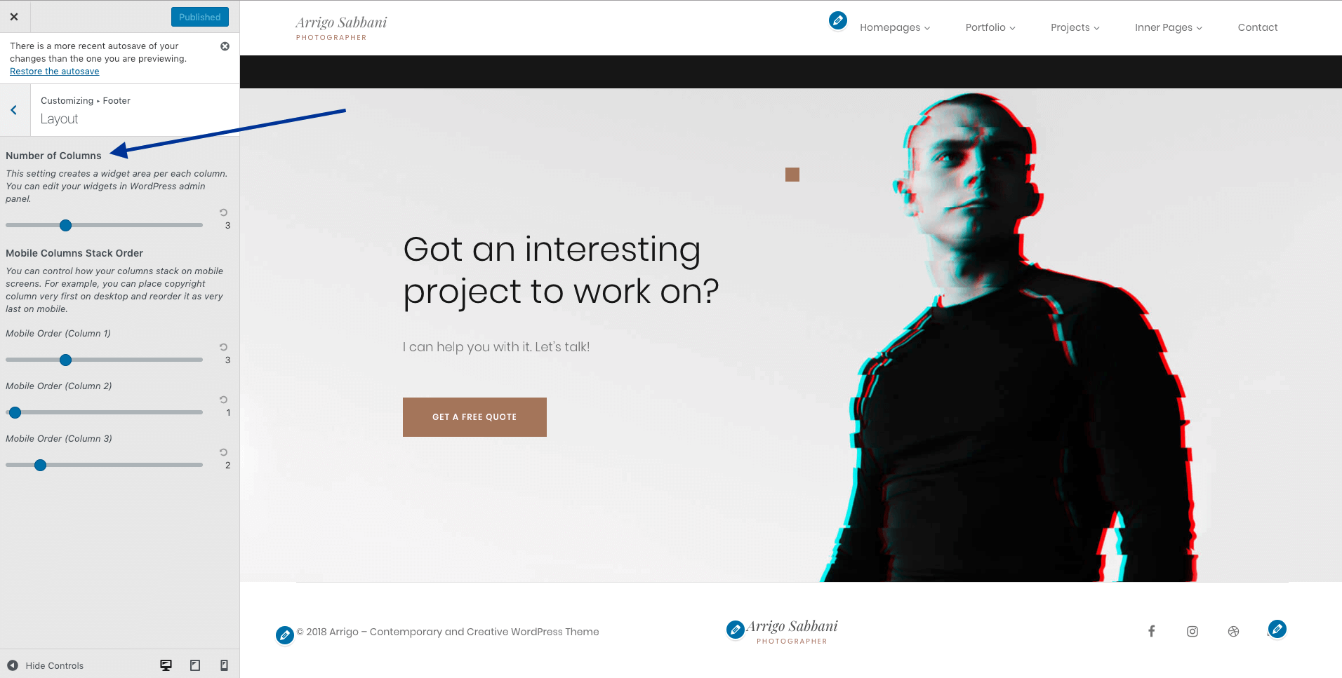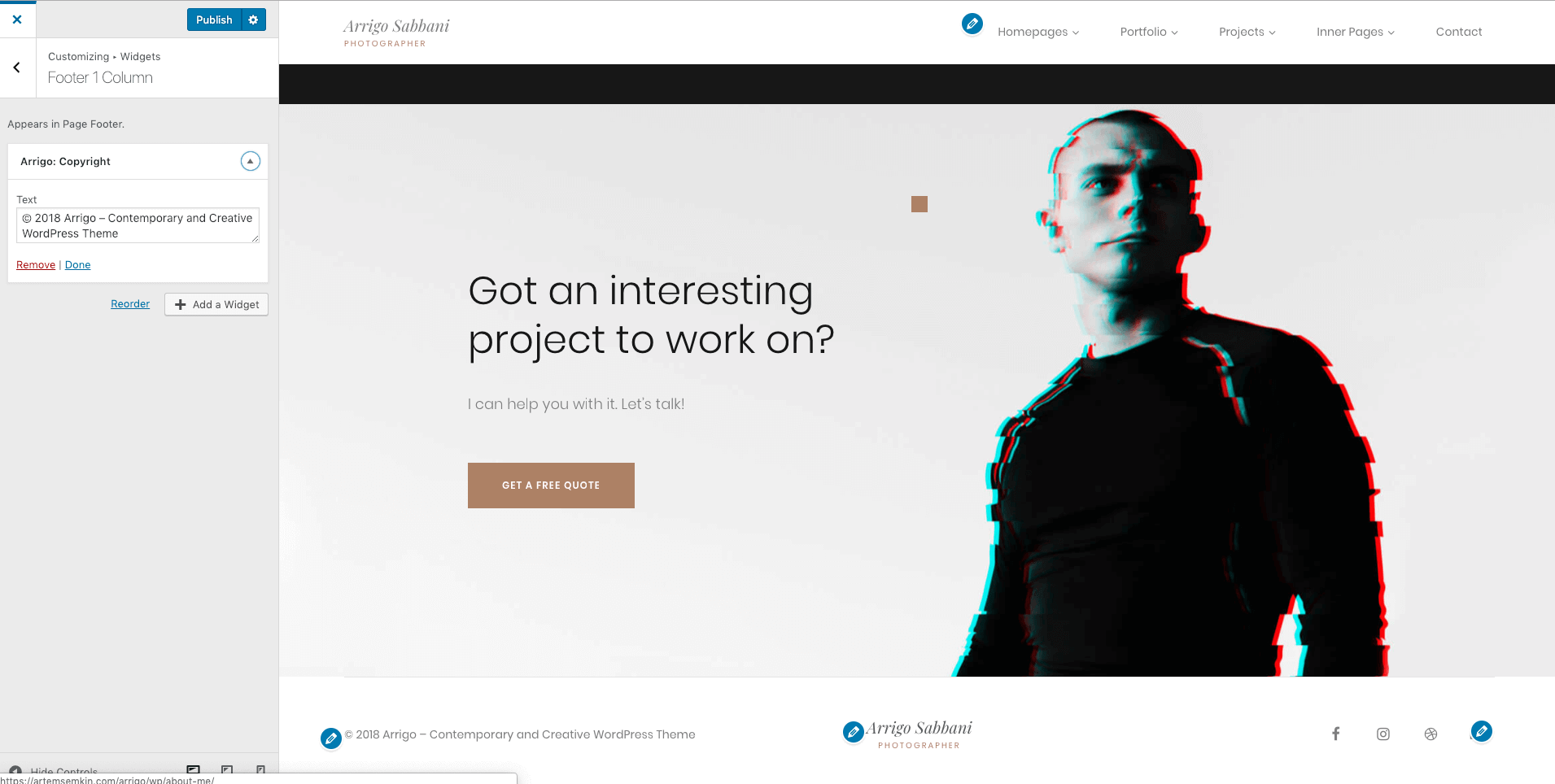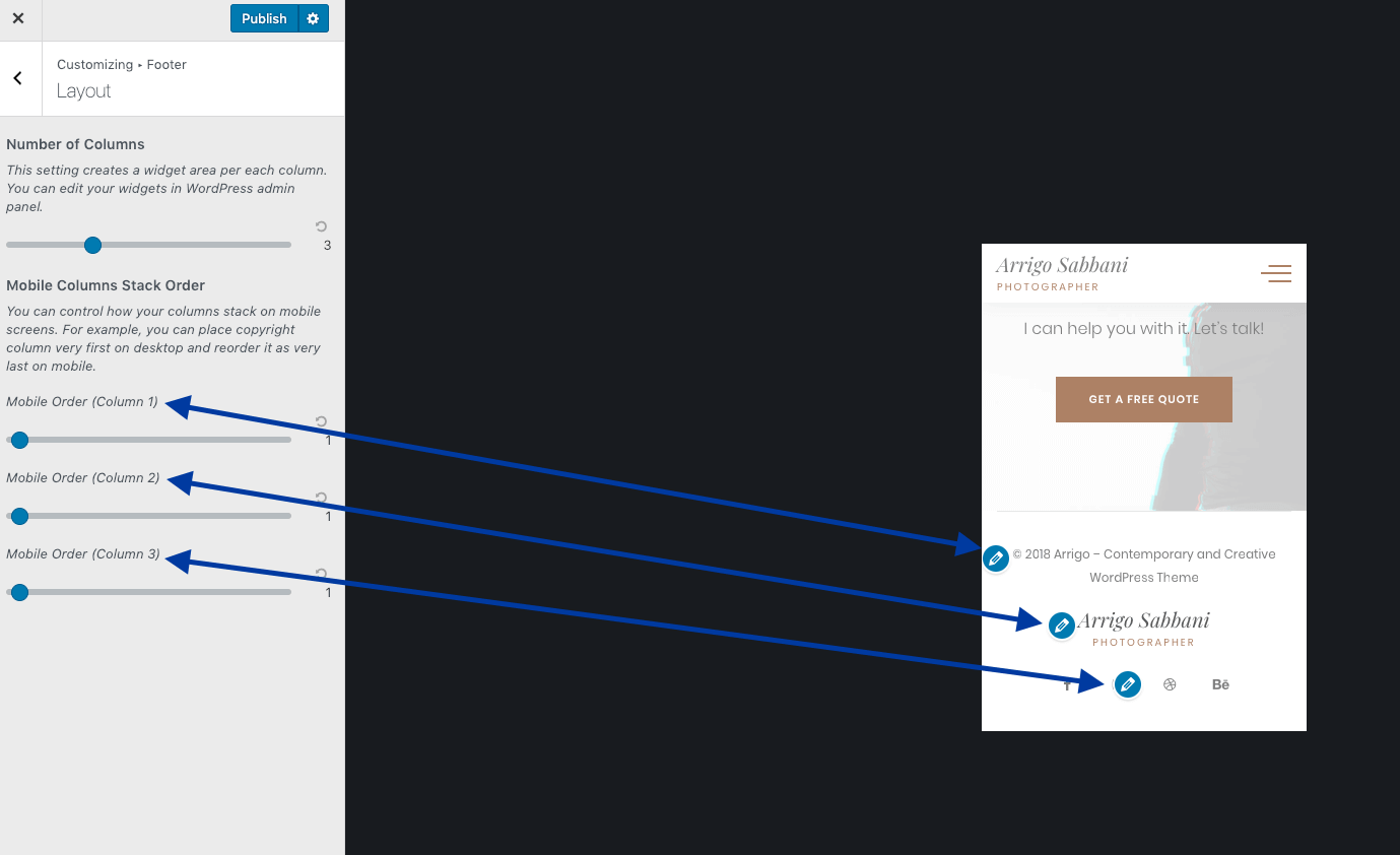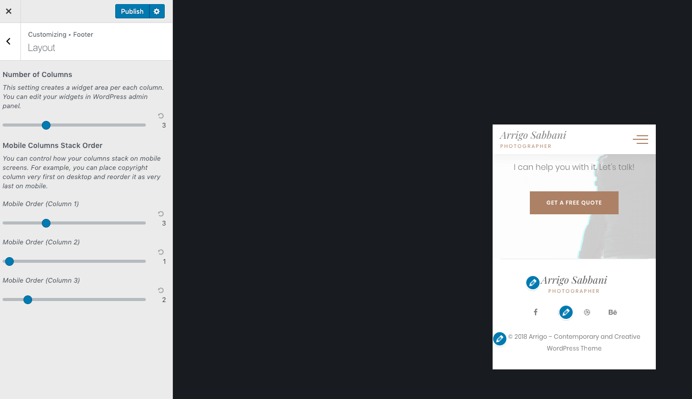 The footer is a widgetized area in the Arrigo theme. For example, to edit copyright info or social media links, you need to edit your widgets. But before doing that, let's see how to adjust the footer layout first.