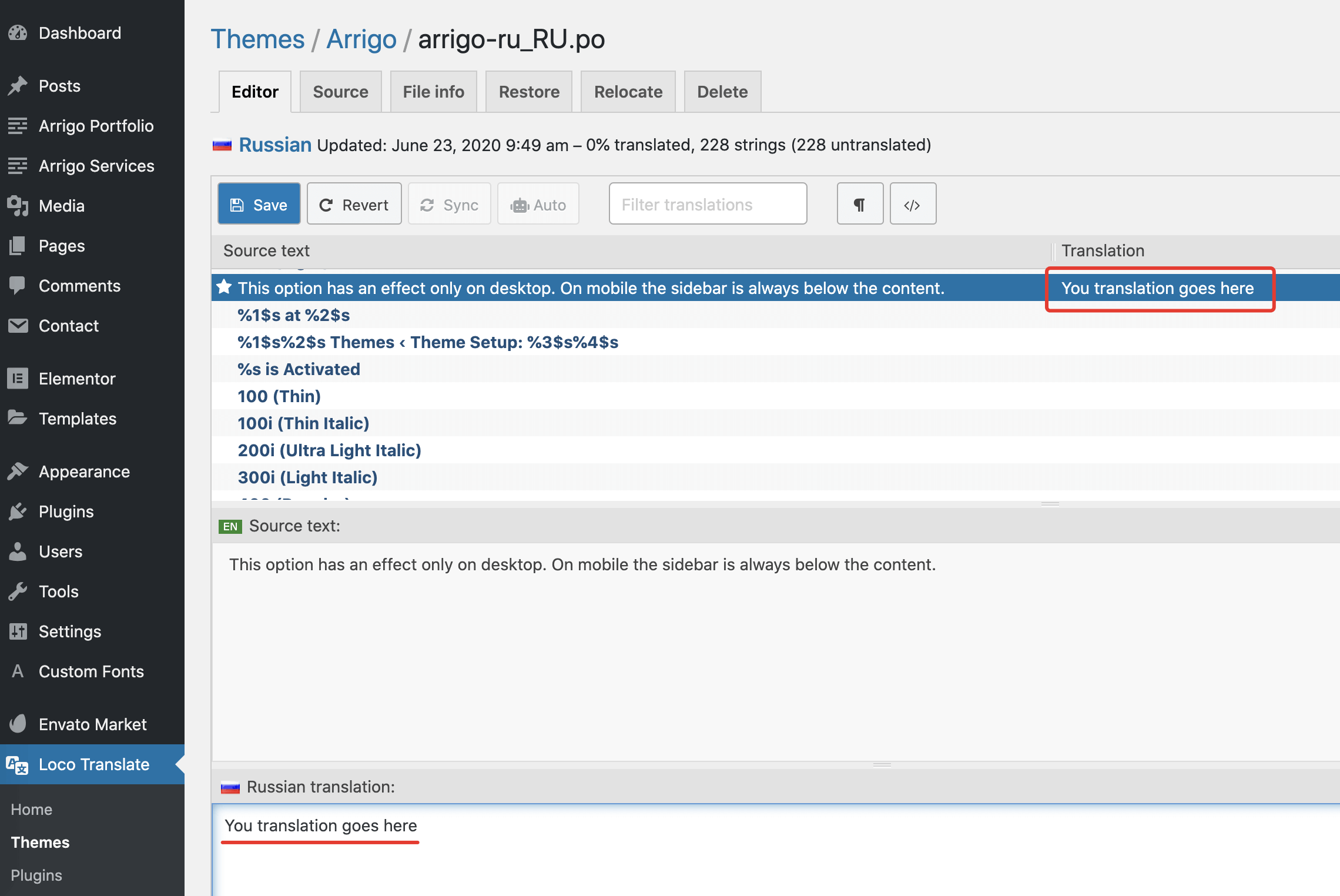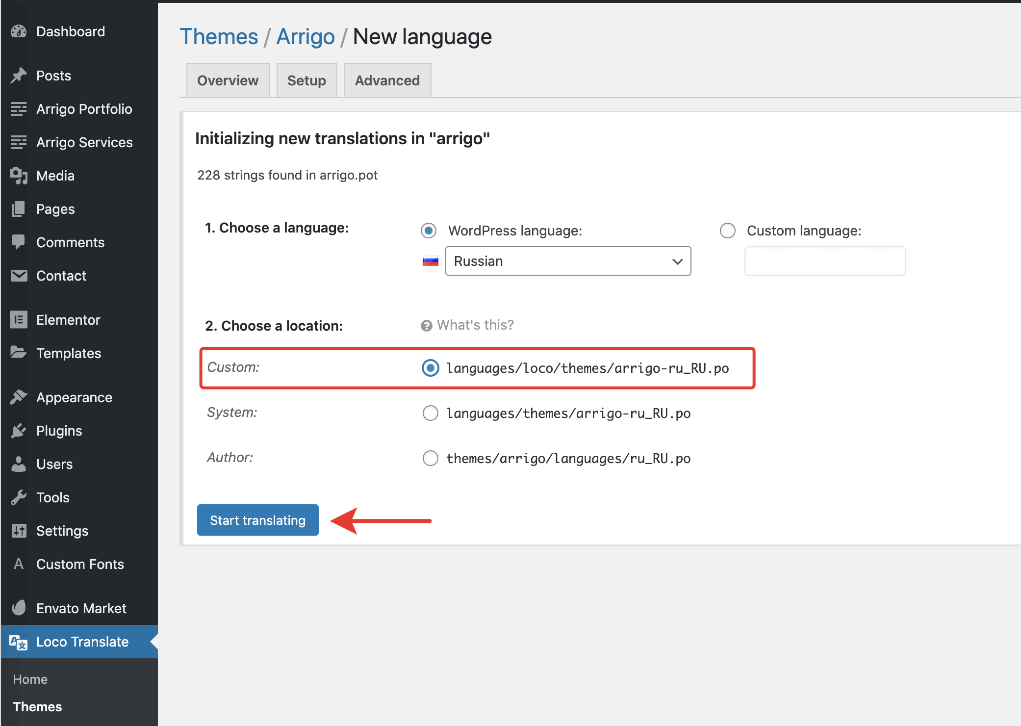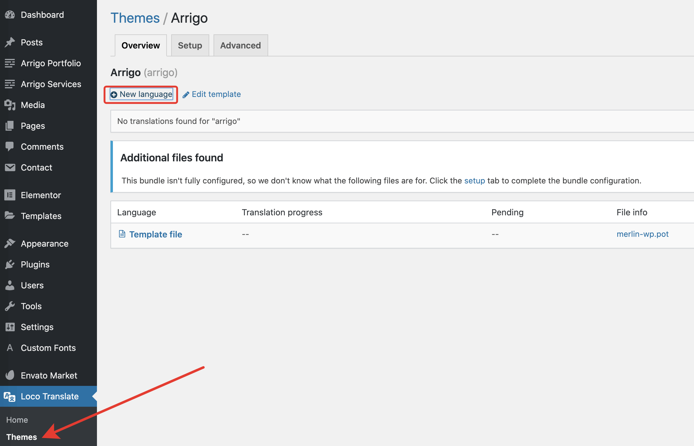 From the admin panel, go to the Loco Translate β Themes menu. This will take you to a list of all available themes in your WordPress. You should see Arrigo in that list. Click it and you should see the following screen: