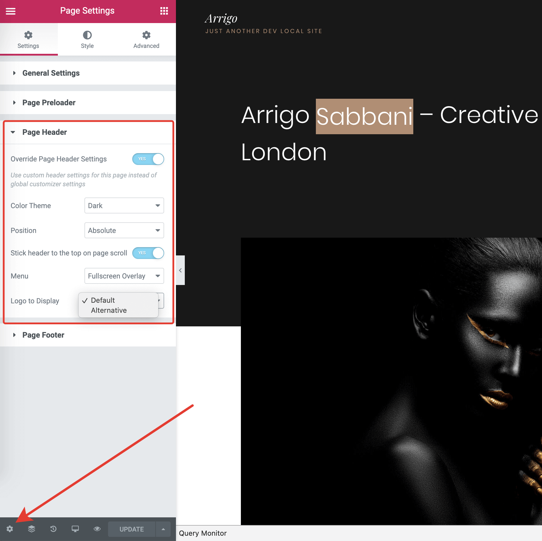 Customizer → Header → StyleNow you'll be able to override the logo version for specific pages in the theme. This allows you to select the "dark" logo version for light pages and the "light" logo version for dark pages. The overrides are tuned in Edit with Elementor -> Document Options -> Page Header.