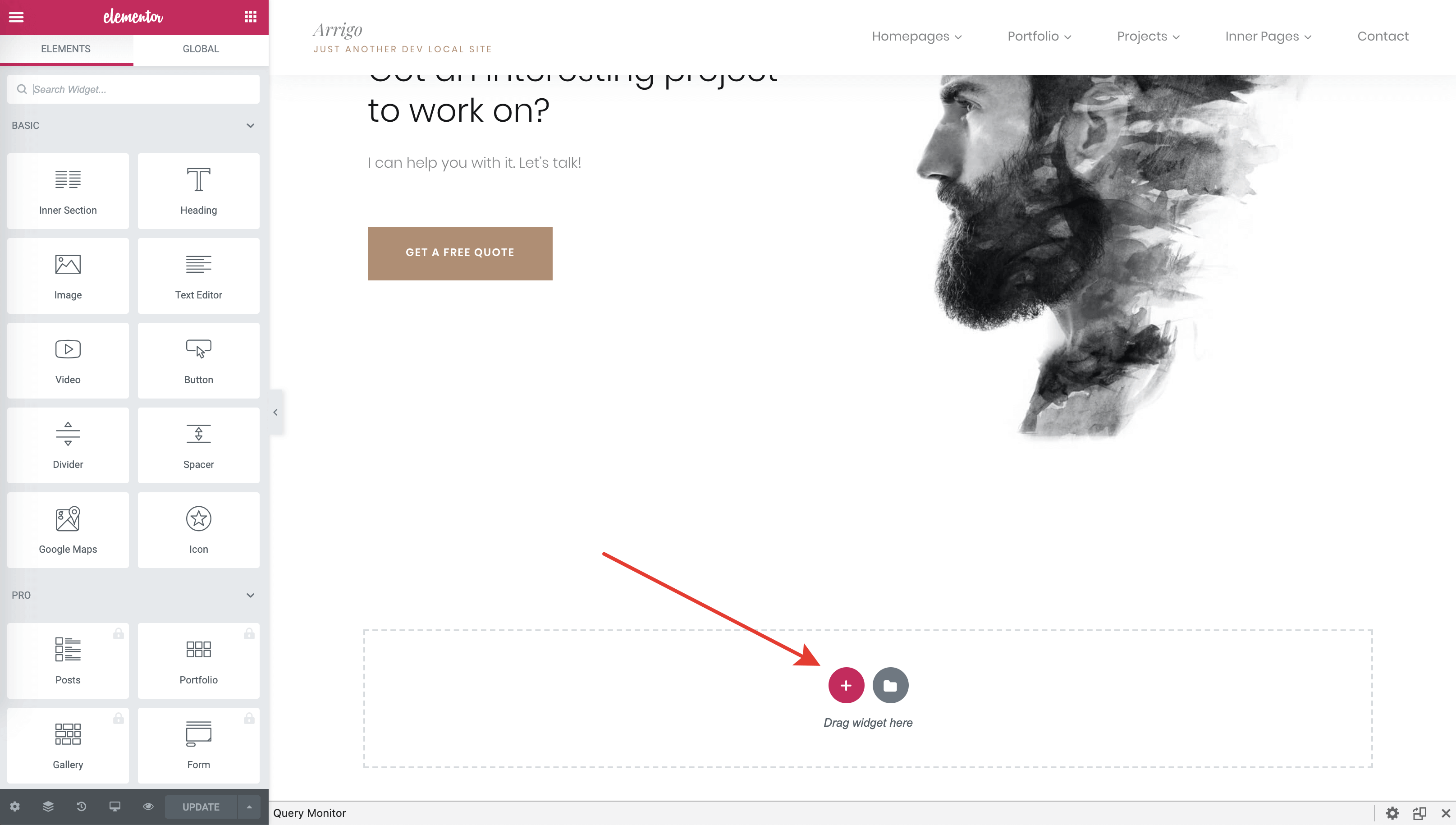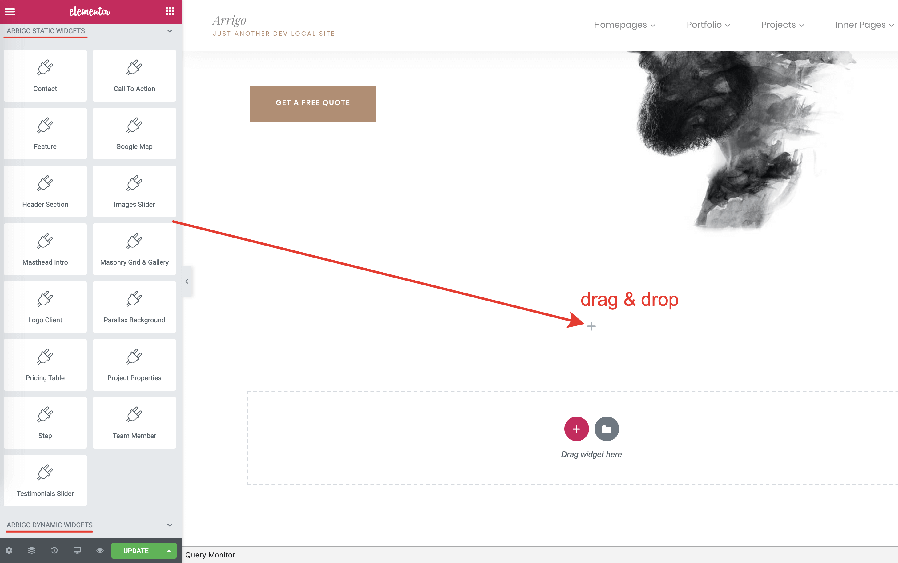 Click on the Grid icon in the left panel. You will see all the available widgets you can place on the page. When the Arrigo Core Plugin is active (required by the theme), you will see 2 extra sections in the Elementor widget panel – Arrigo Static Widgets and Arrigo Dynamic Widgets.