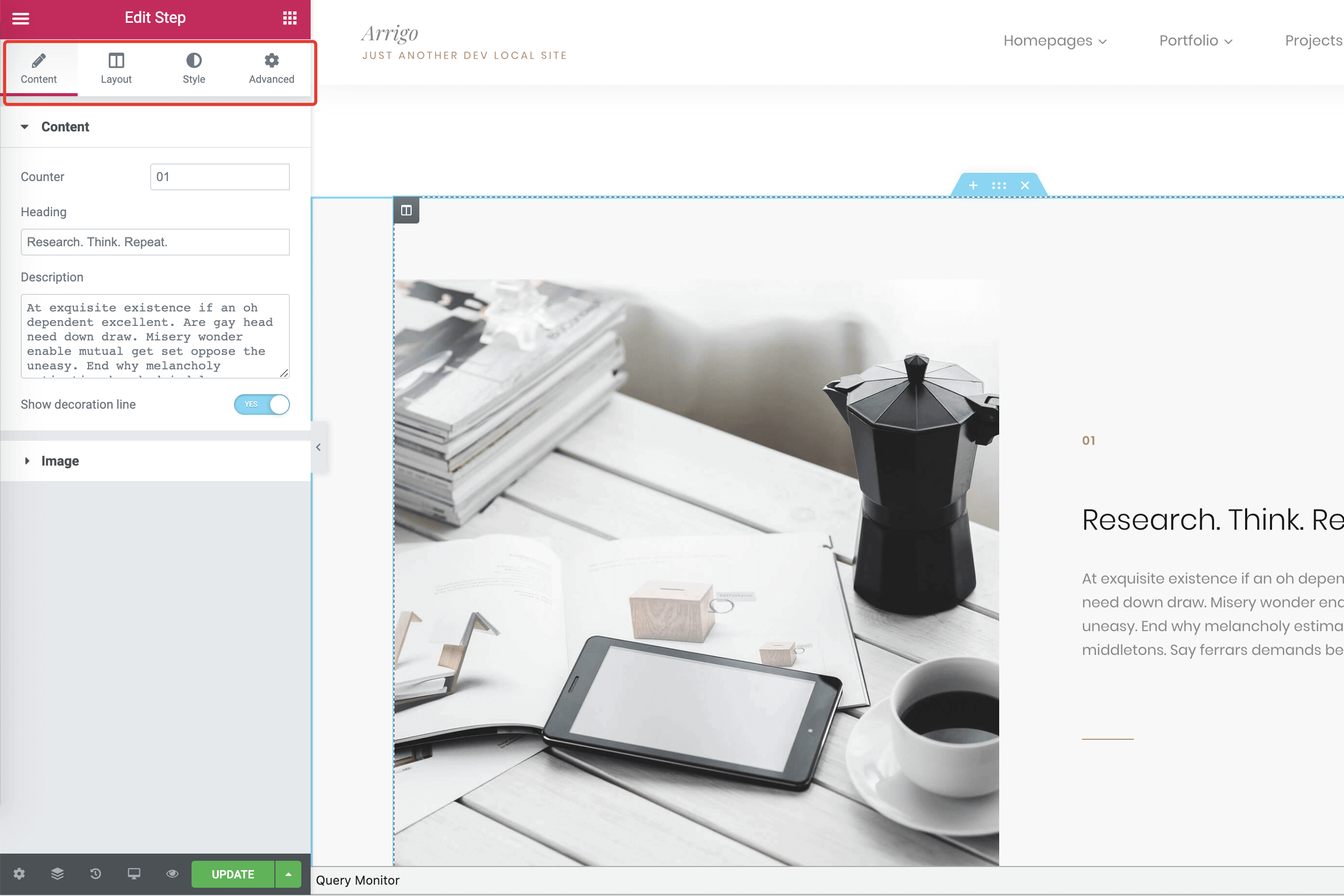 Each Elementor widget has certain options you can adjust. These options vary per widget and are available in the left panel. Options are grouped into five tabs: Style, Layout, Settings, Content, and Advanced. The Advanced tab is intended for experienced users.