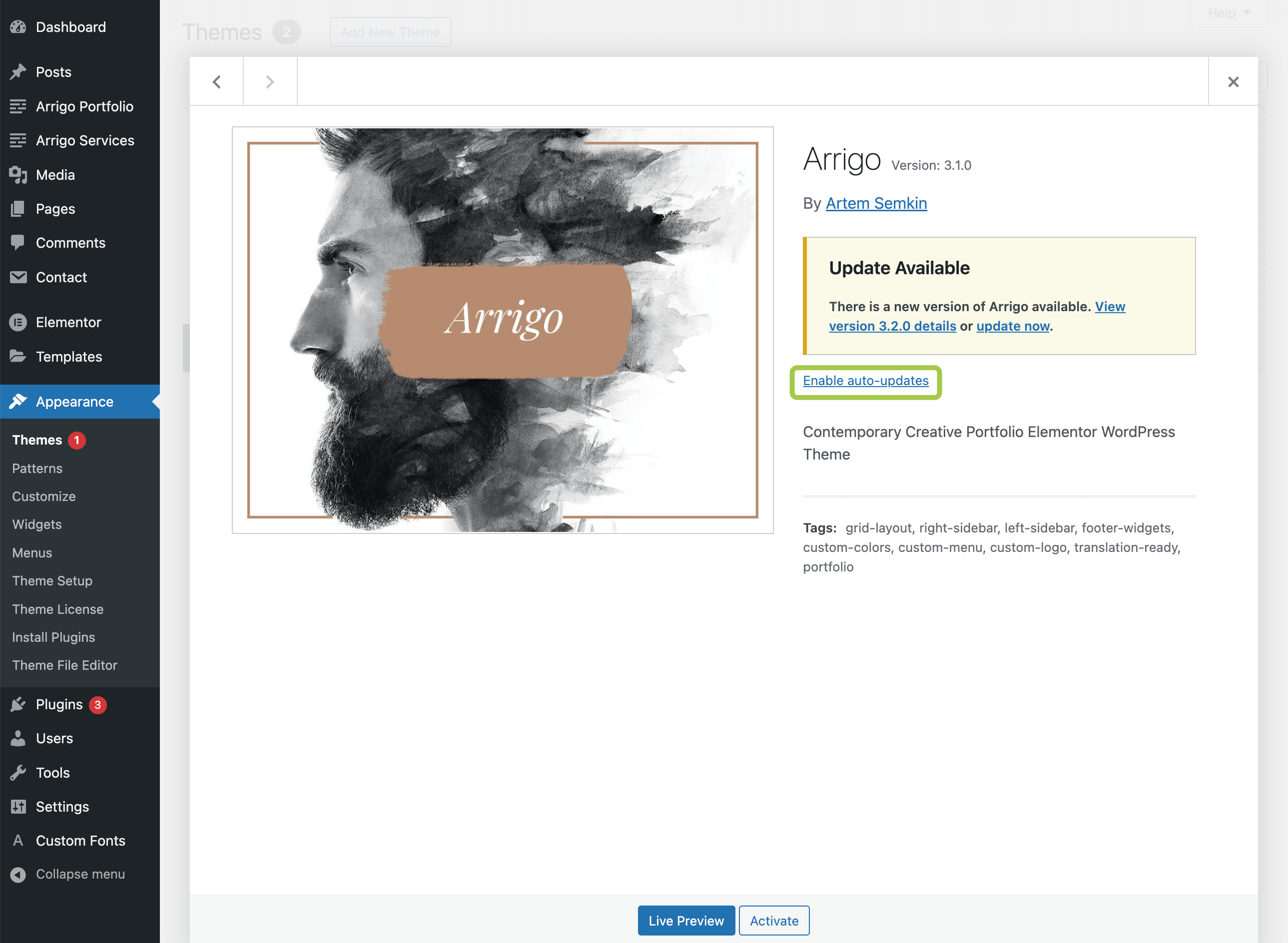 To ensure compatibility with the latest WordPress and plugins required by the theme, it's recommended to turn on automatic theme updates: