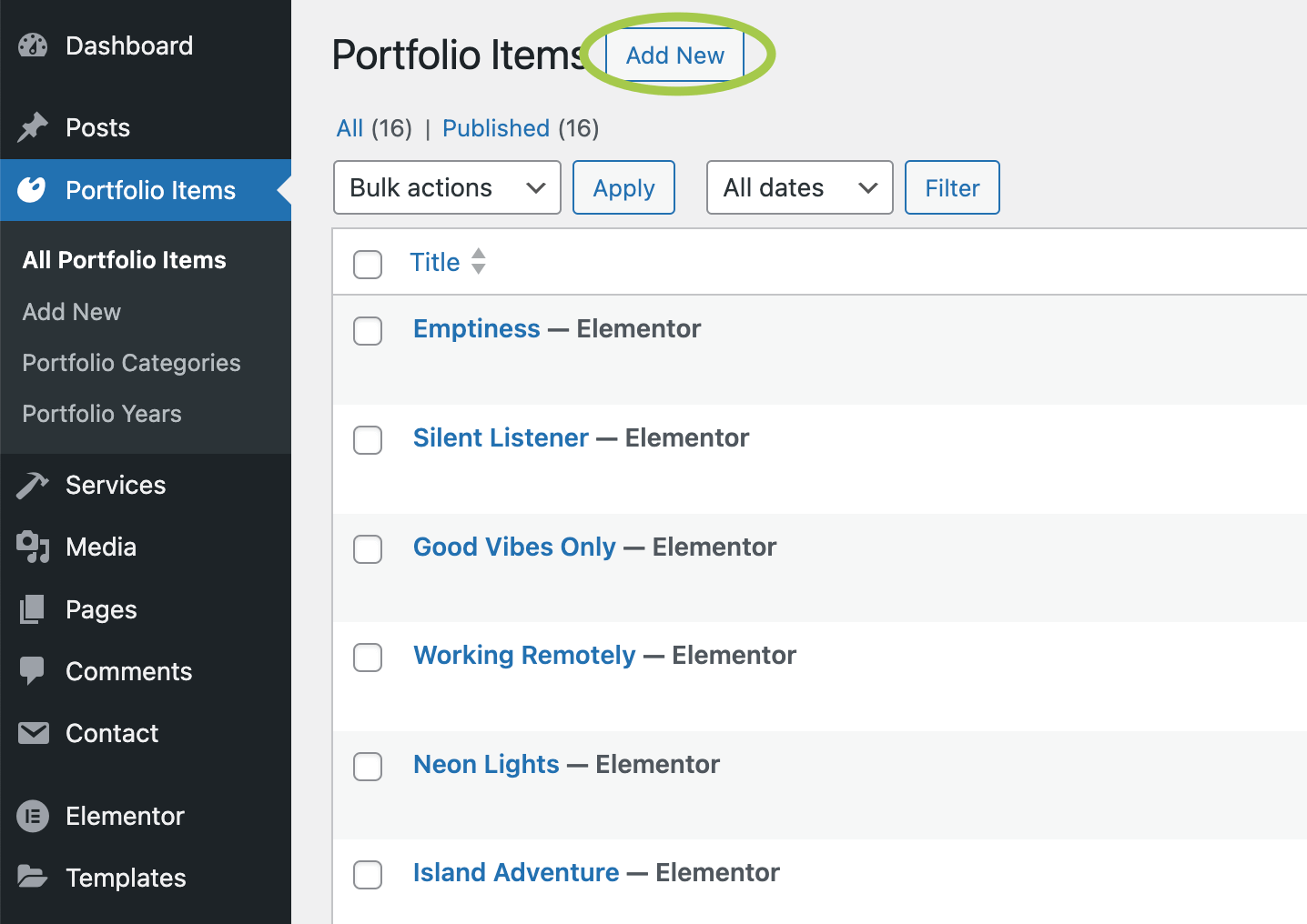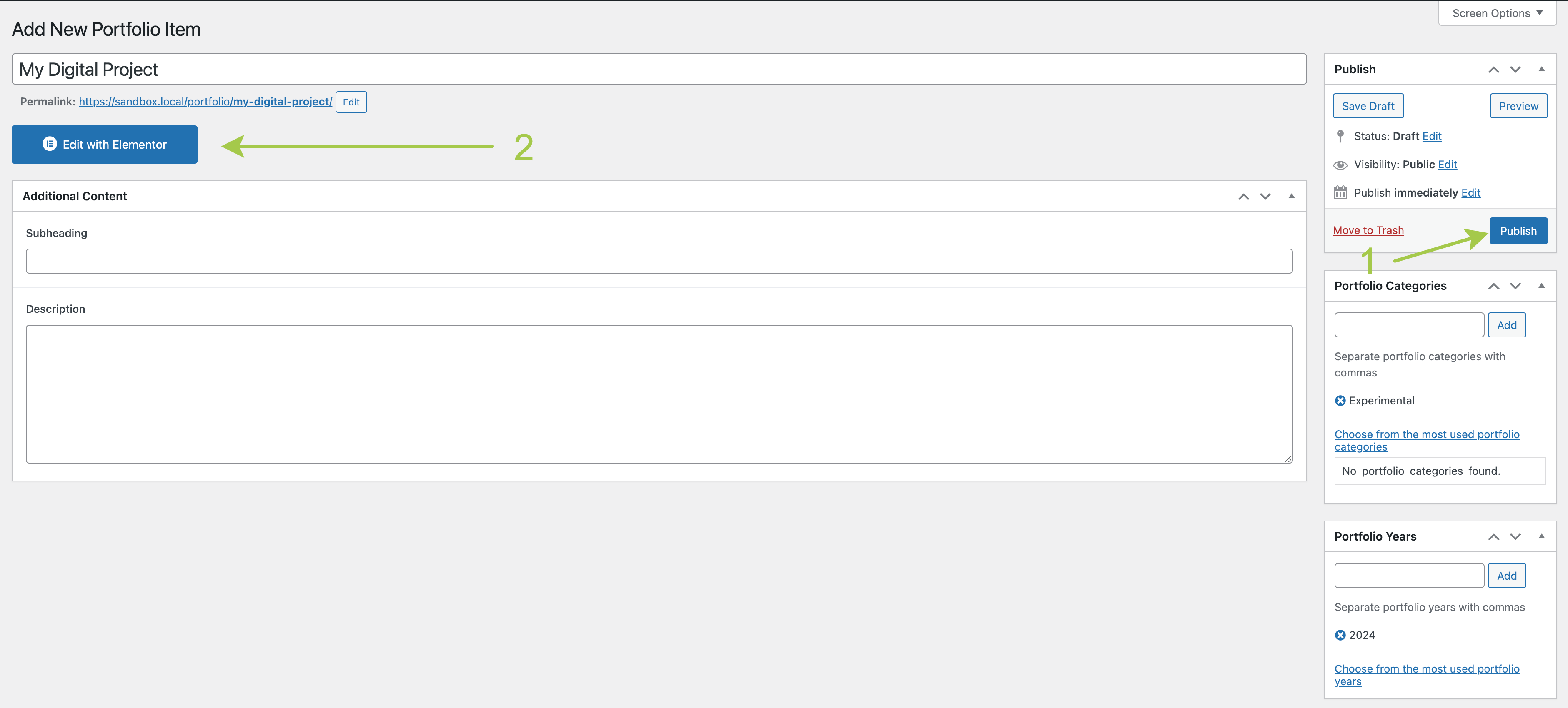 Your new portfolio item is now saved in WordPress. You can start adding content!