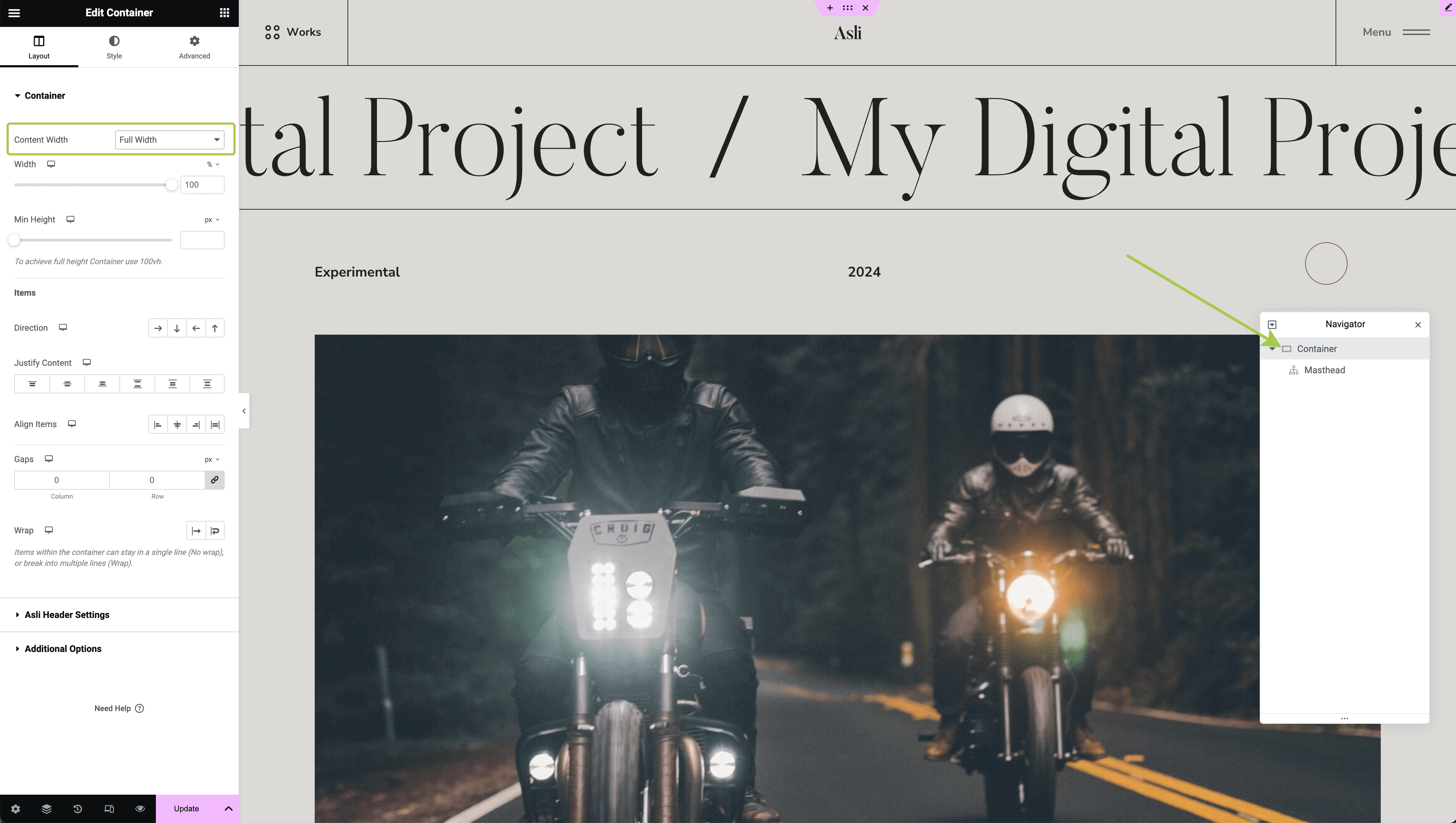 Open the Navigator (right-click anywhere on the page to open it) and select the parent Masthead container. Make it full width.