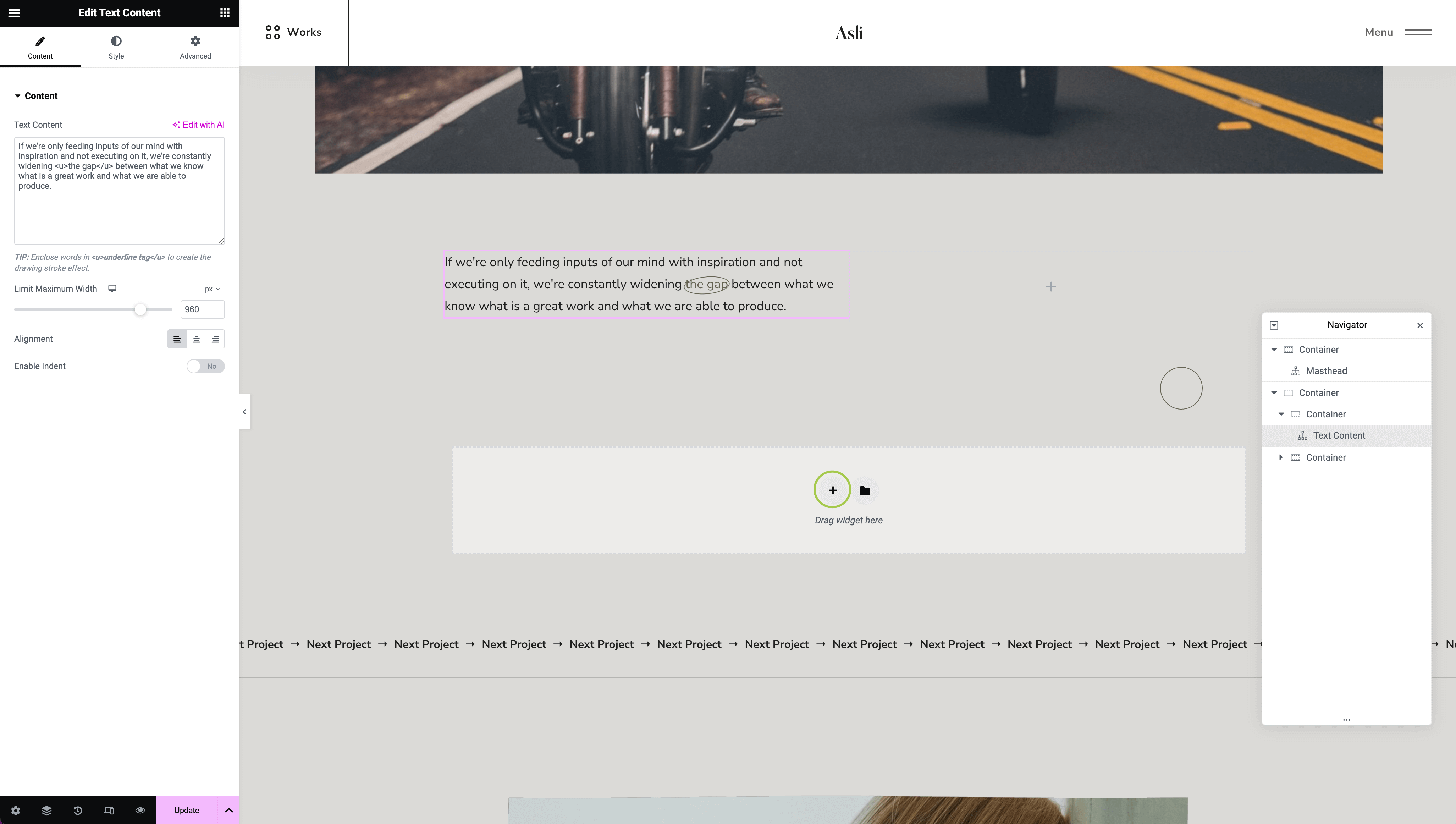 Before adding content, let’s make some styling adjustments. Search for the "Masthead" widget, then drag and drop it onto the page.