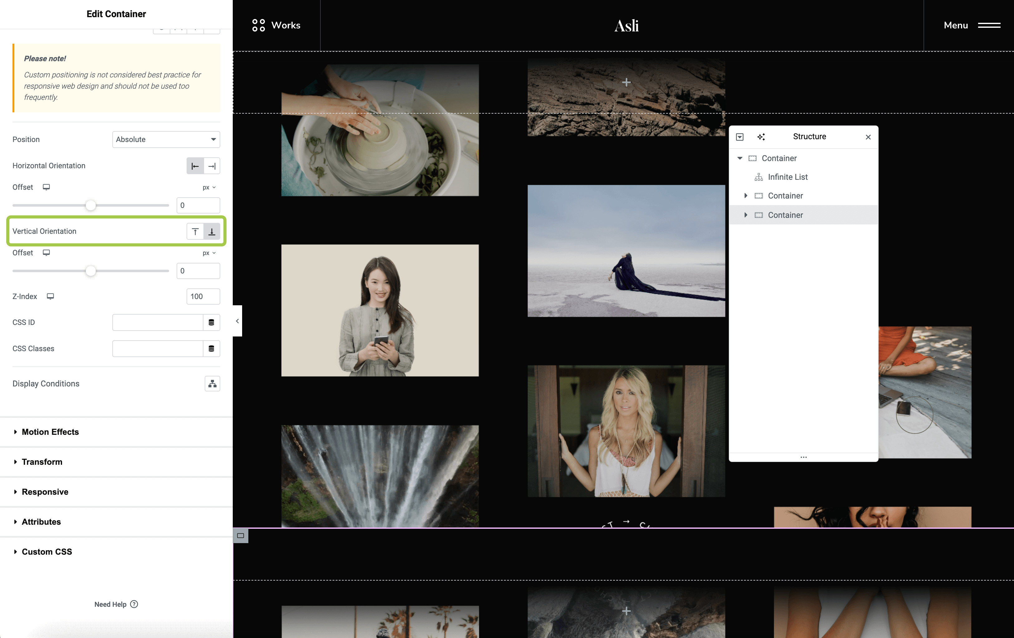 To fix this, select the parent container of your element and apply the + Header Height preset under Advanced Tab -> Asli: Fluid Margins -> Margin Top.