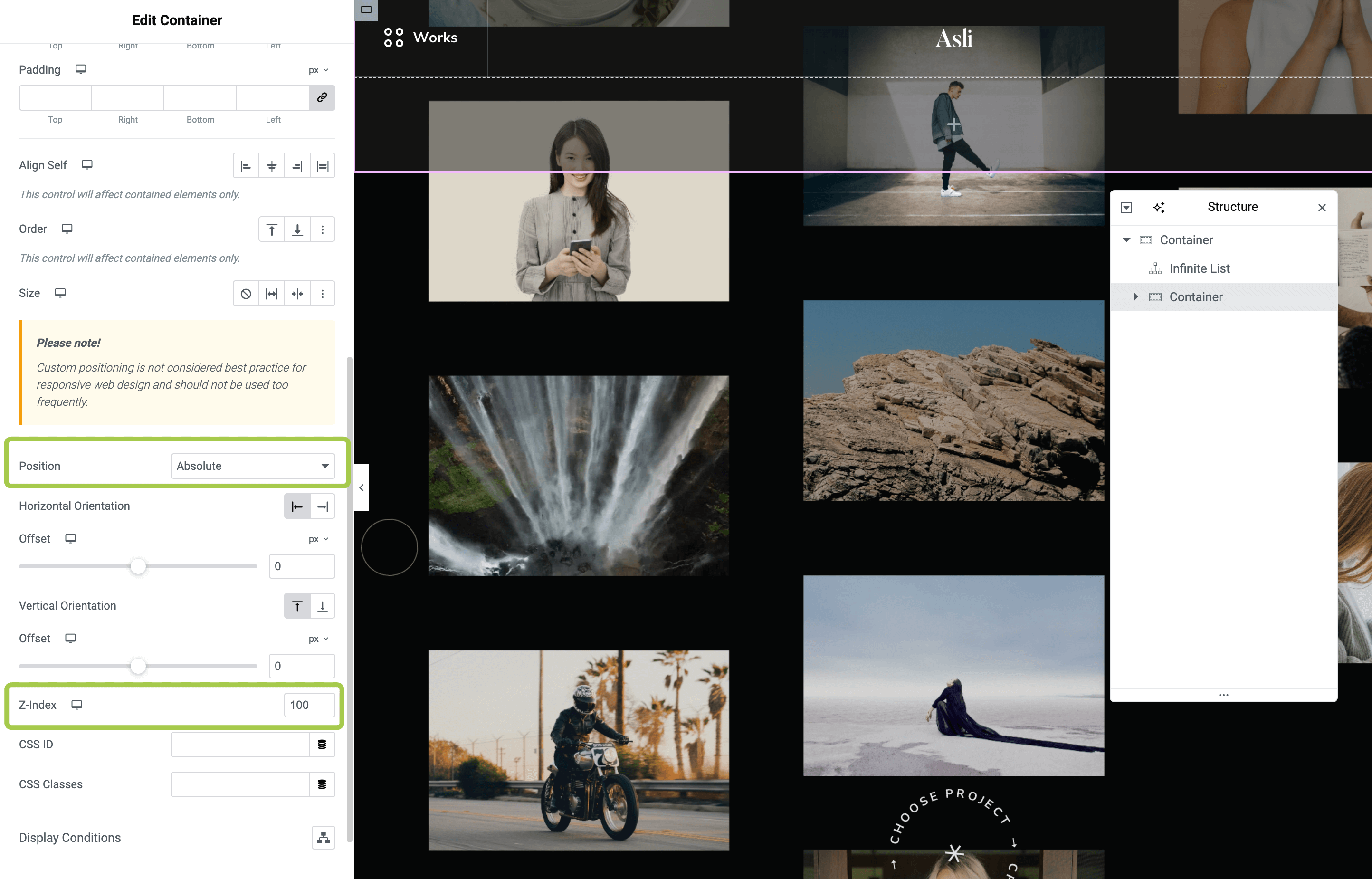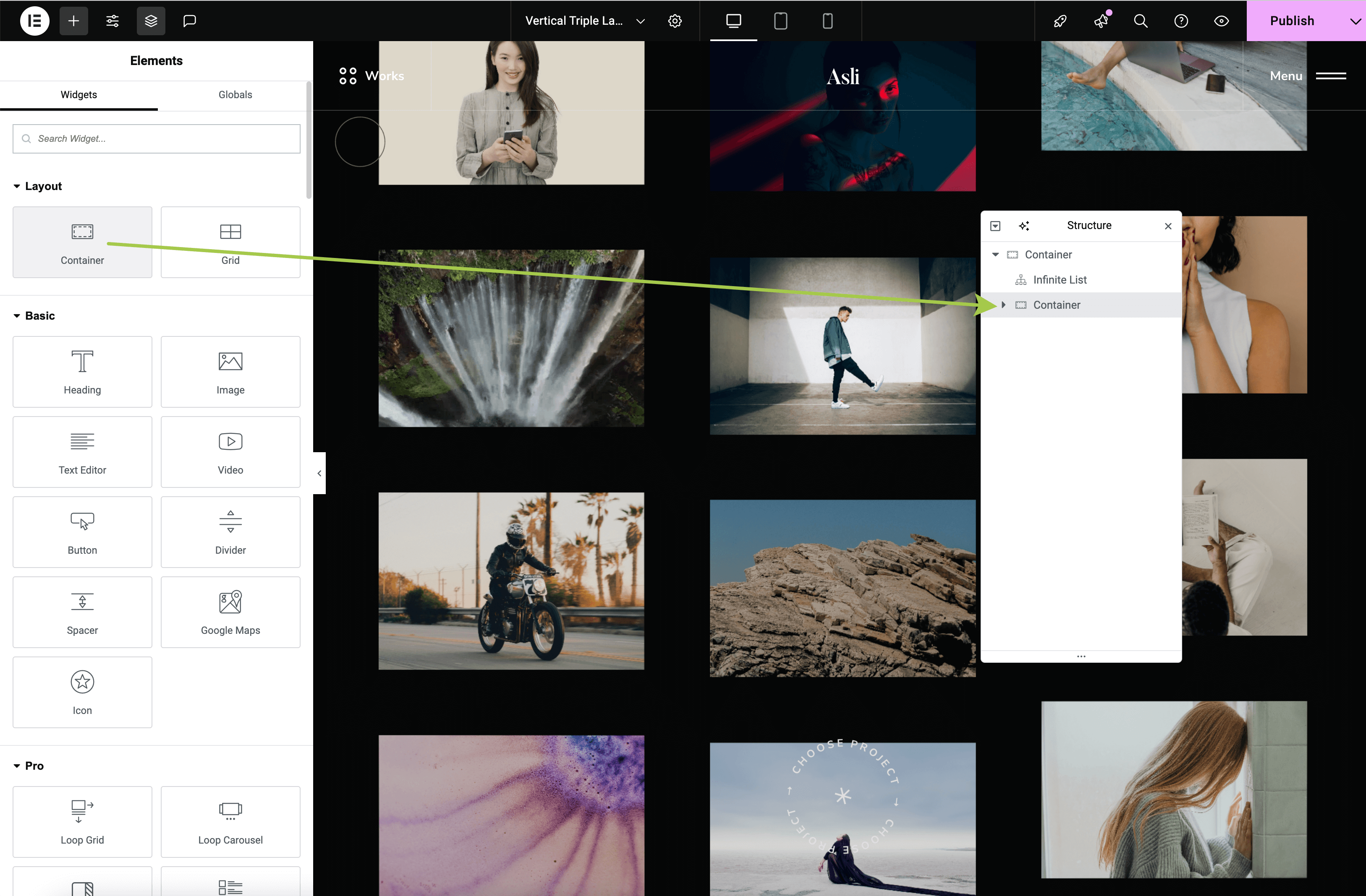 Create a new Container and place it next to the Infinite List widget.