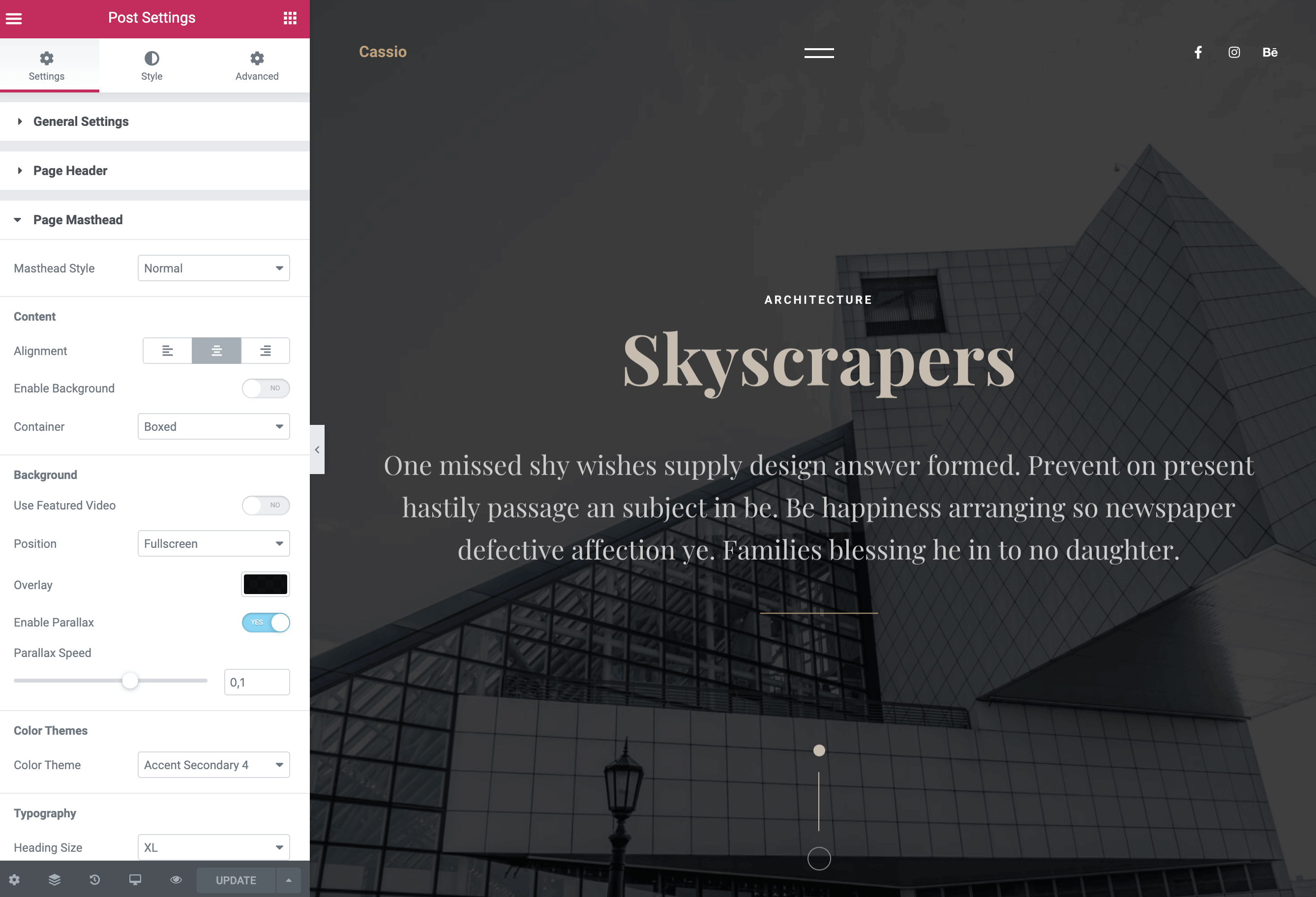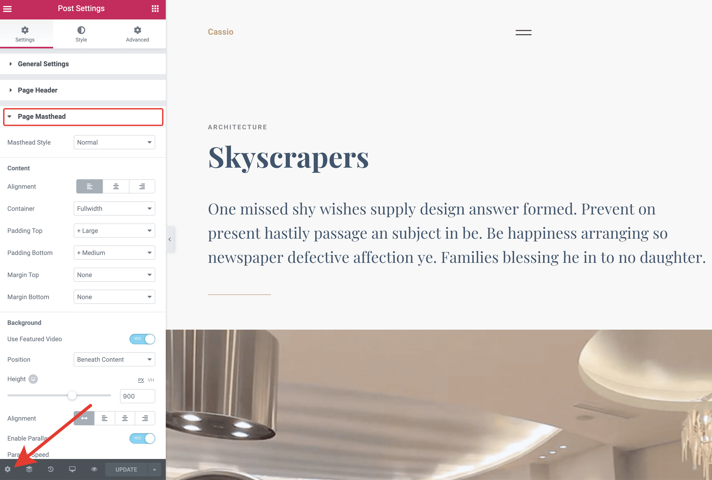 You will see that the new portfolio item is saved to the WordPress database and we are ready to fill it with content! But before that, let’s make some styling adjustments. While in Edit with Elementor mode, go to Document Settings → Page Masthead and make the necessary adjustments. You have plenty of options to play with here.