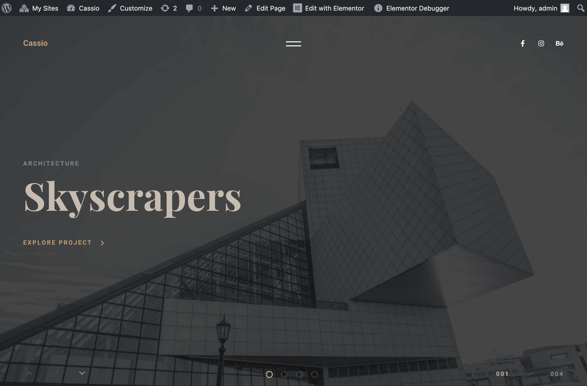 In Cassio theme, pages are created normally like in any other WordPress themes. The specific difference is that you need to click the Edit with Elementor button after creation to use the live page builder for that page. There are additional features available which we will explore now.