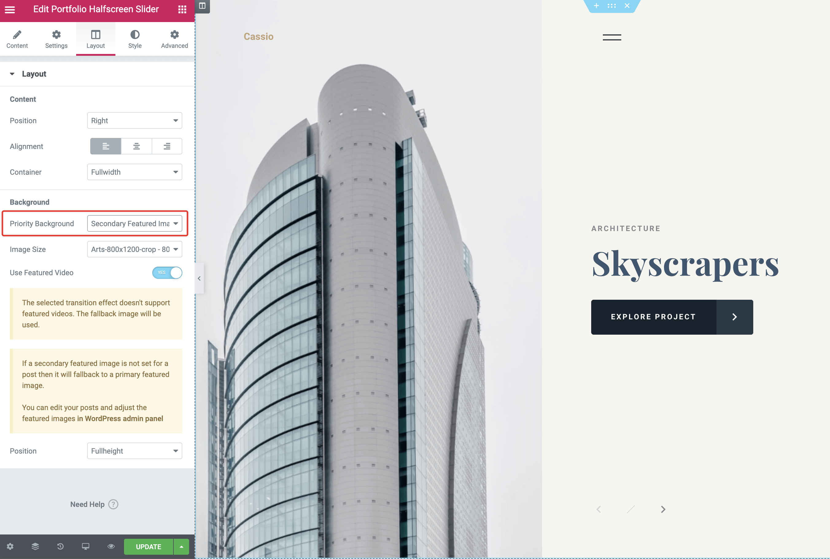 When you save a new portfolio item, it will be automatically fetched in dynamic Elementor widgets. For example, here is a fullscreen slider widget where our new portfolio item just appeared.
