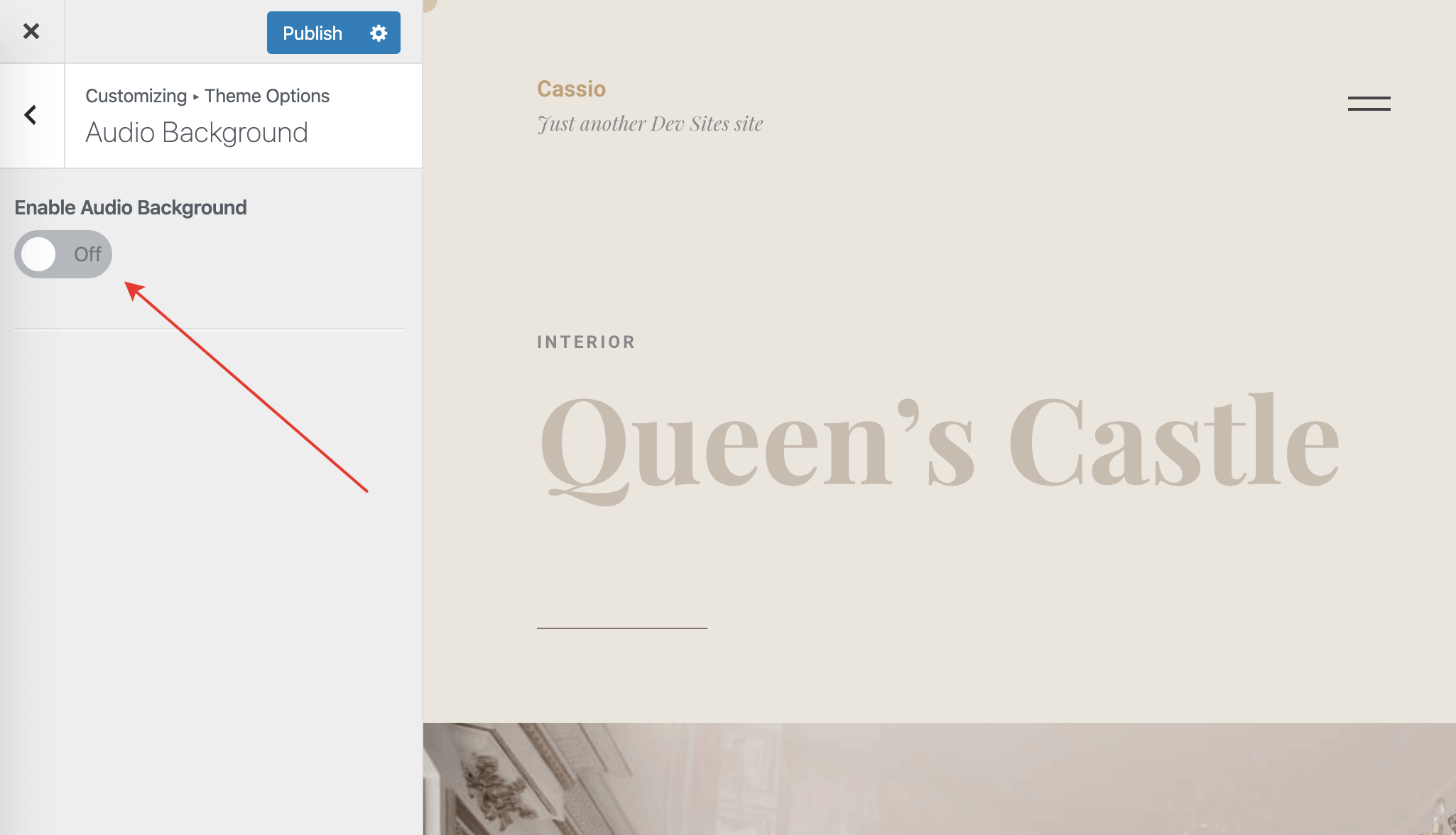 The theme supports an audio background feature that enables continuous playback of *.mp3, *.wav, or *.ogg files while browsing the website. To enable audio backgrounds, go to Customizer → Theme Options → Audio Background and toggle the appropriate switch control.