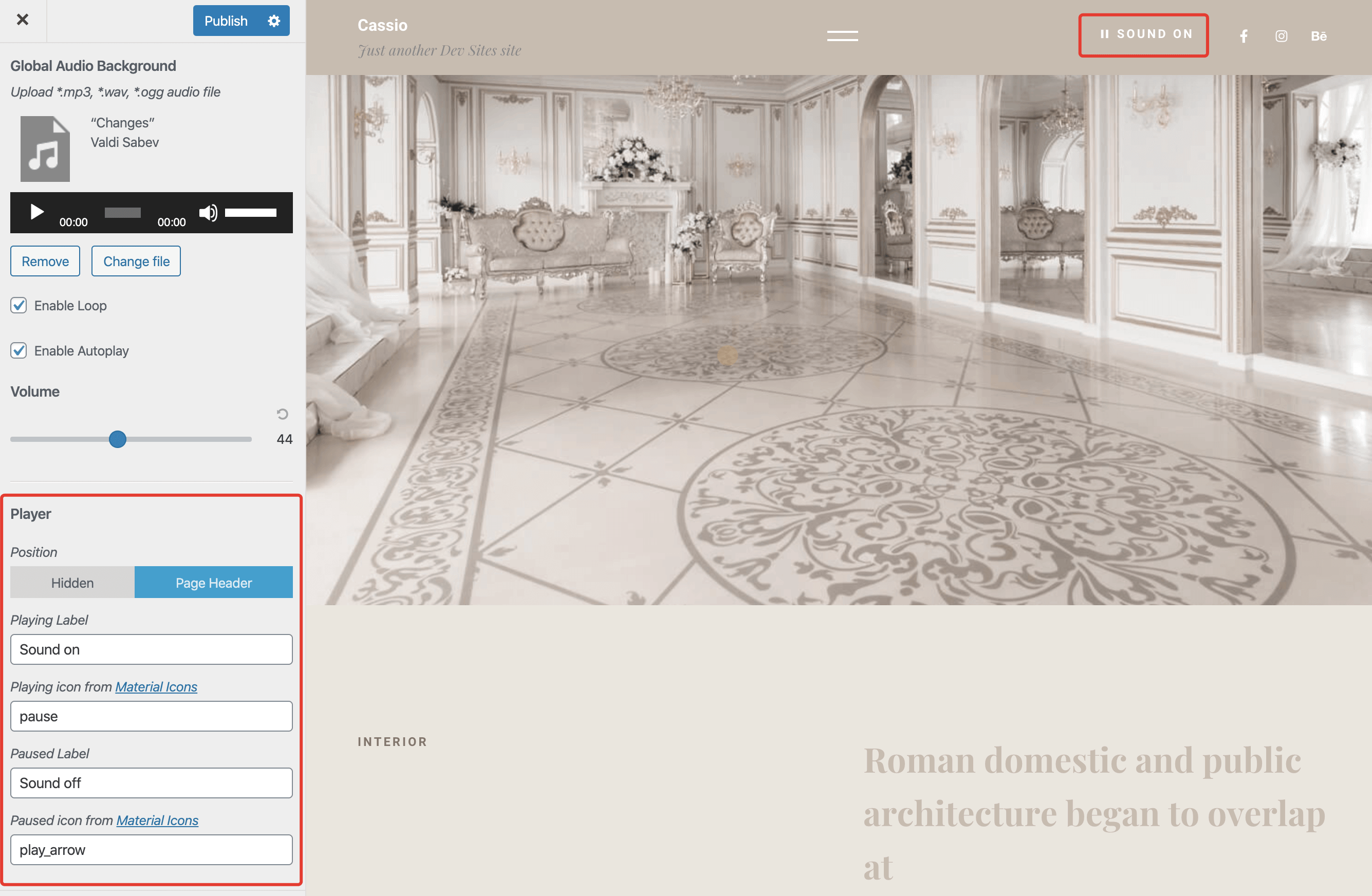 You may upload a music file that will play continuously while a visitor navigates your website. A simple audio player will appear in the page header, allowing users to play or pause the background music.
