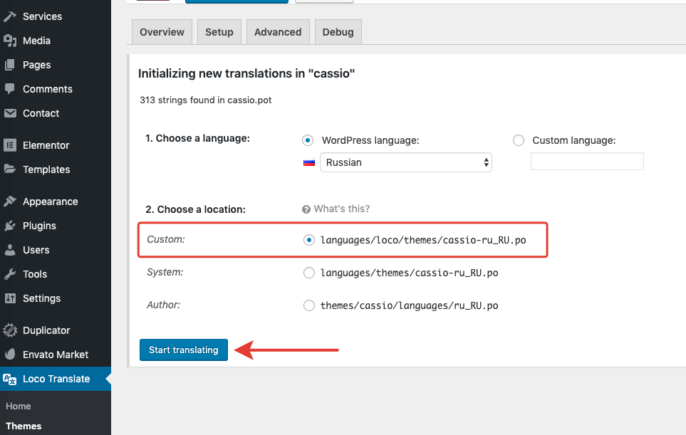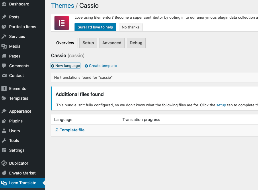 From the admin panel, go to the Loco Translate β Themes menu. This will take you to a list of all available themes in your WordPress. You should see Cassio in that list. Click it and you should see the following screen: