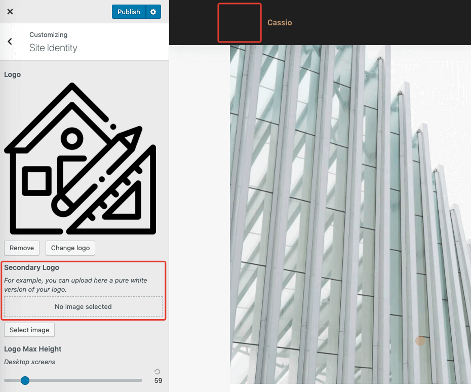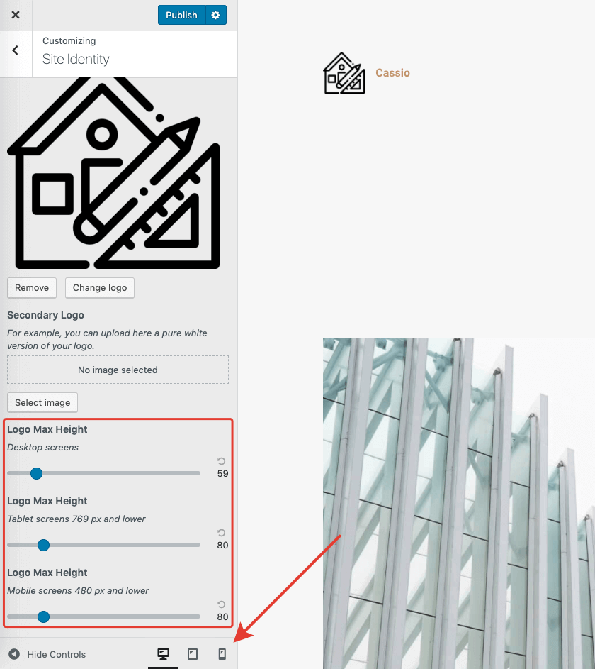 Some WordPress themes restrict you to specific logo dimensions, which may result in a "too small" or "too big" look for some logos. Cassio has special options for tailoring logo height for different screen sizes, which can be very handy.