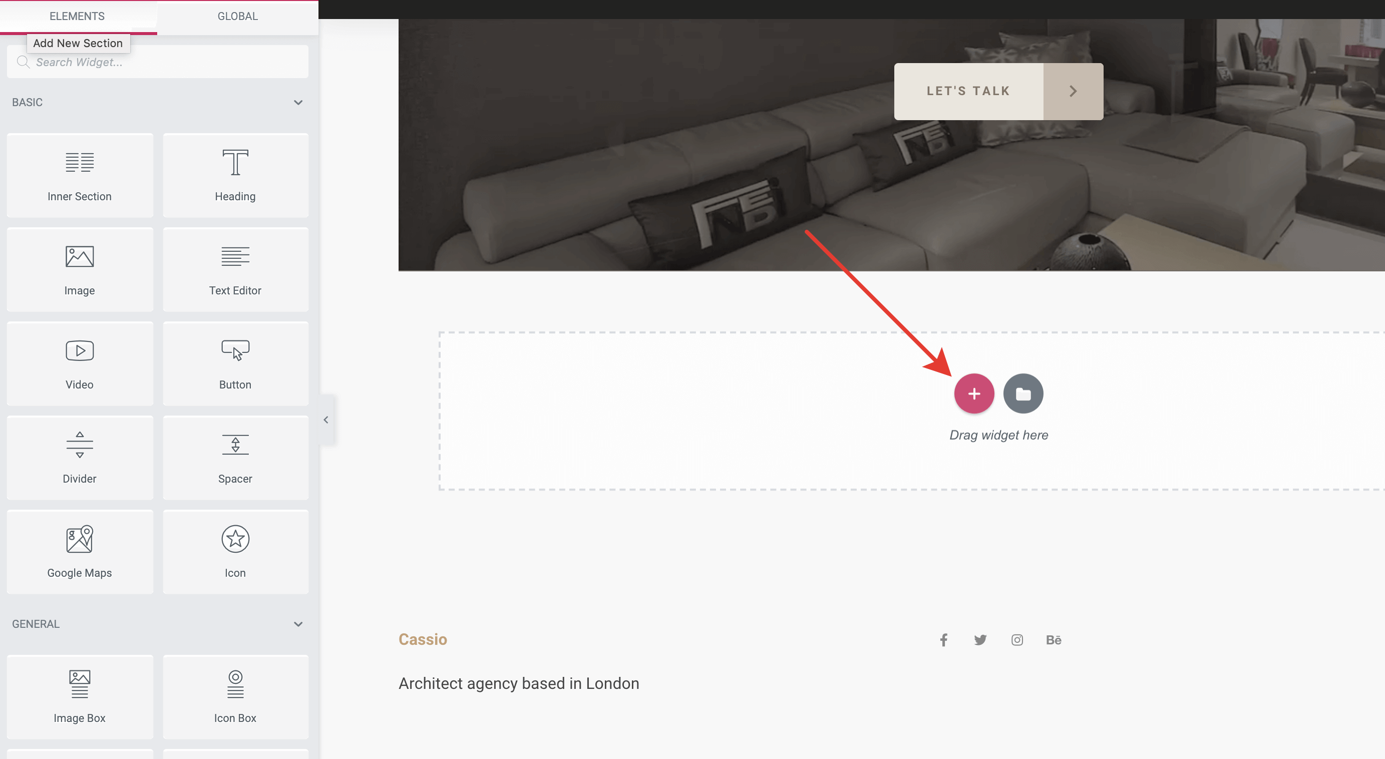 When editing a page with Elementor, click on the Plus sign.
