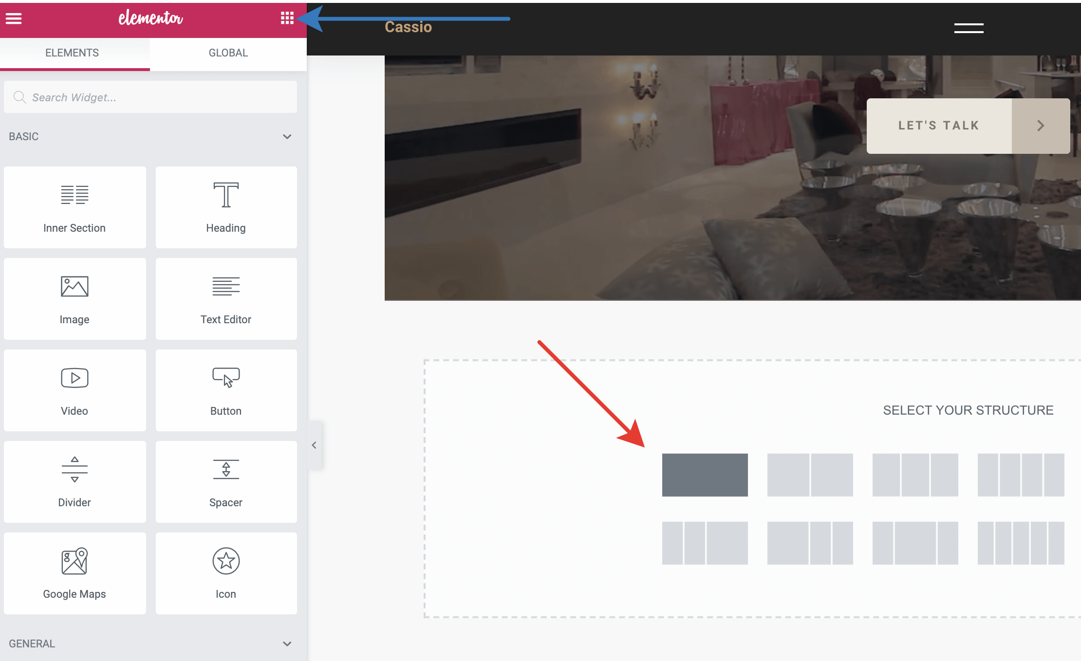 Click on the Grid icon in the left panel. You will see all the available widgets you can place on the page. When the Cassio Core Plugin is active (required by the theme), you will see two extra sections in the Elementor widget panel – Cassio Static Widgets and Cassio Dynamic Widgets.