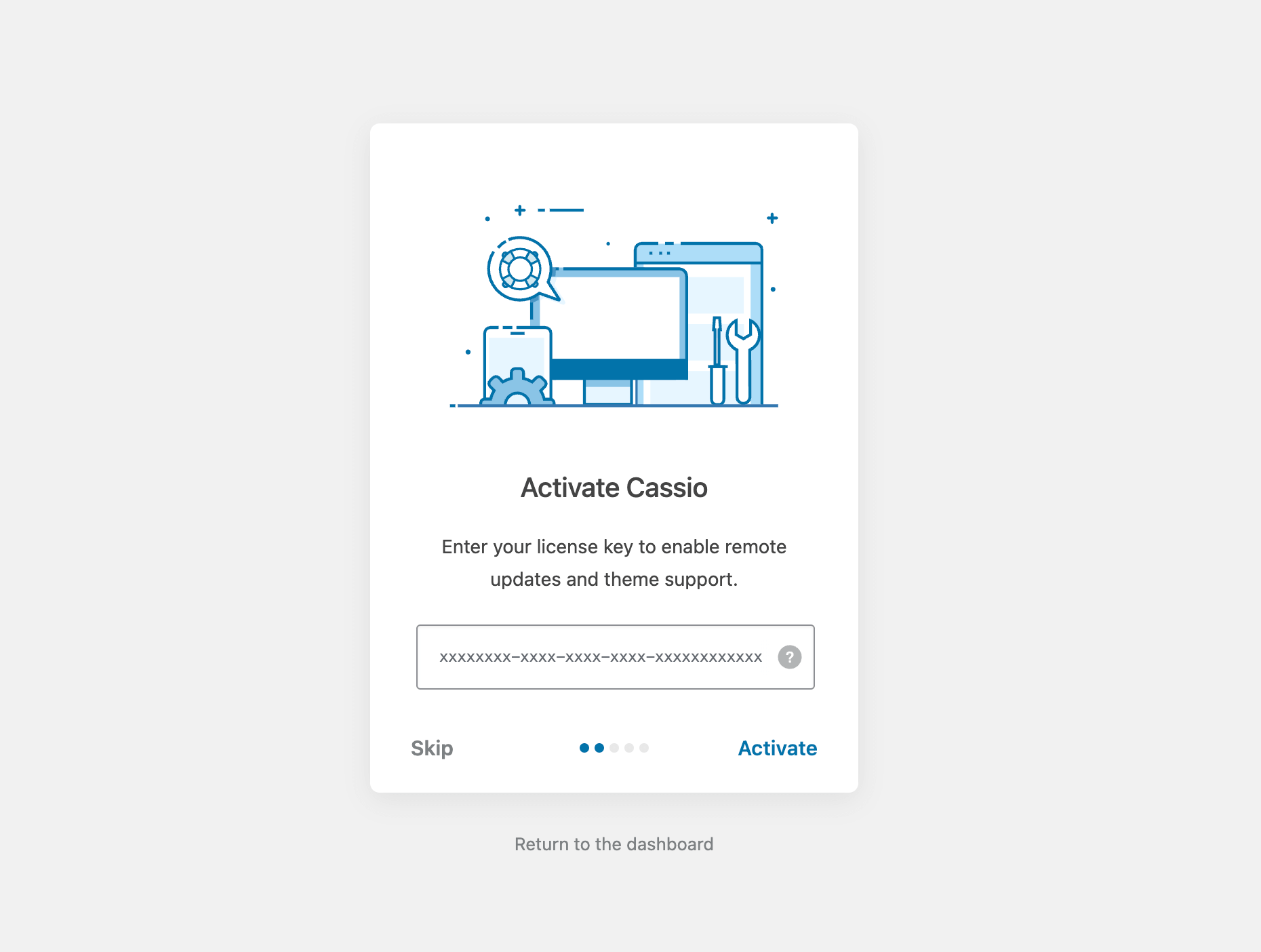 Activate your theme license by entering the purchase code. If you don't have a purchase code yet – e.g., you downloaded the theme via Envato Elements, please click the Skip button.
