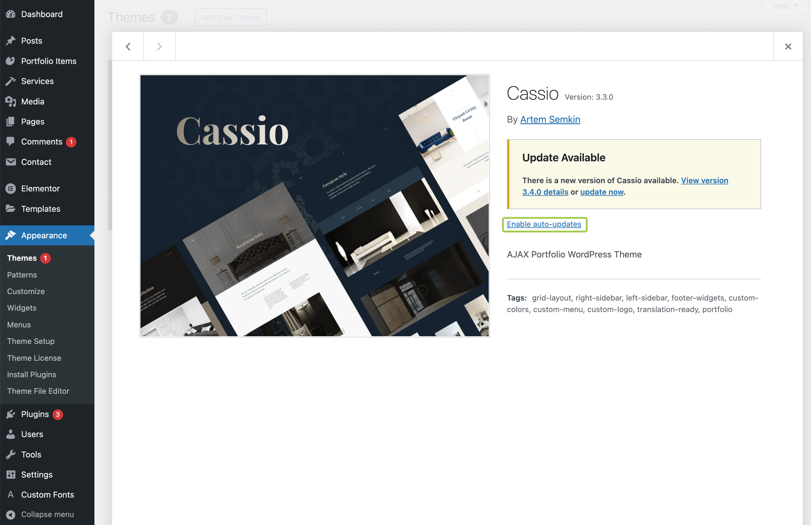 To ensure compatibility with the latest WordPress version and the plugins required by the theme, it's recommended to turn on automatic theme updates: