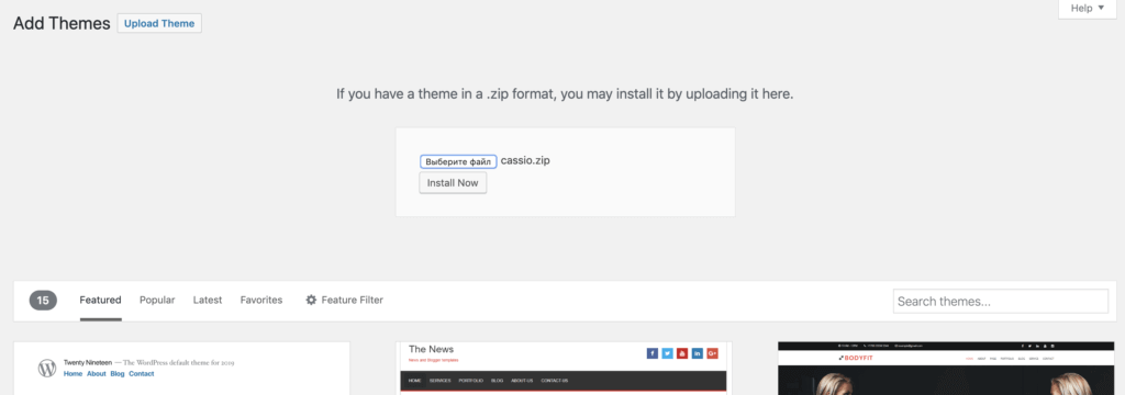 Select your downloaded theme file 📄 cassio.zip and click Install Now.