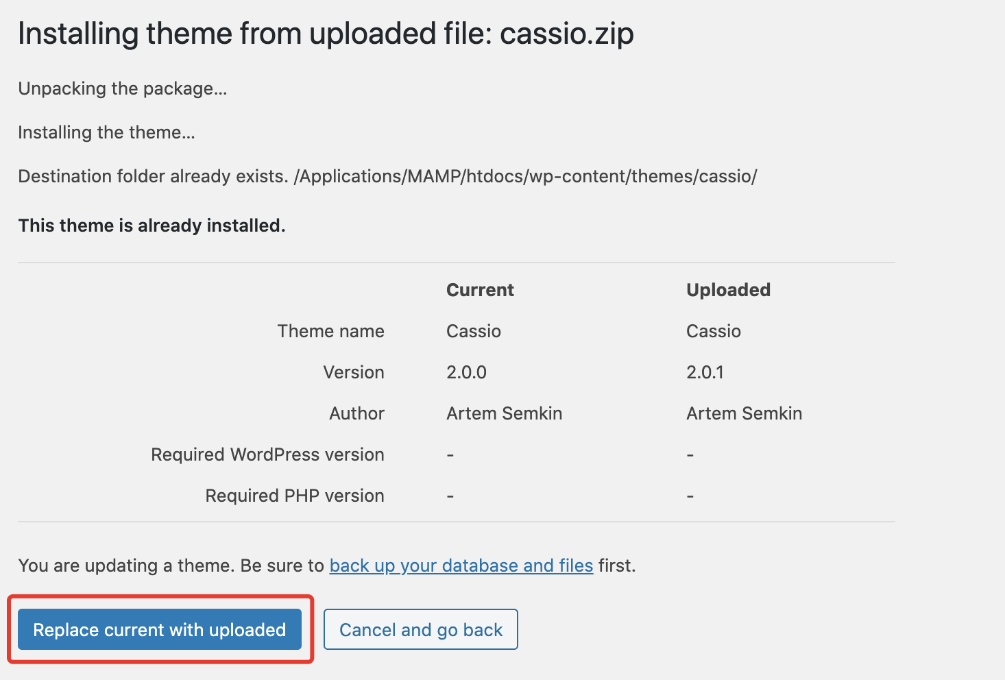 You'll be notified that a theme with the same name already exists. Click Replace current with uploaded to finish the update process.