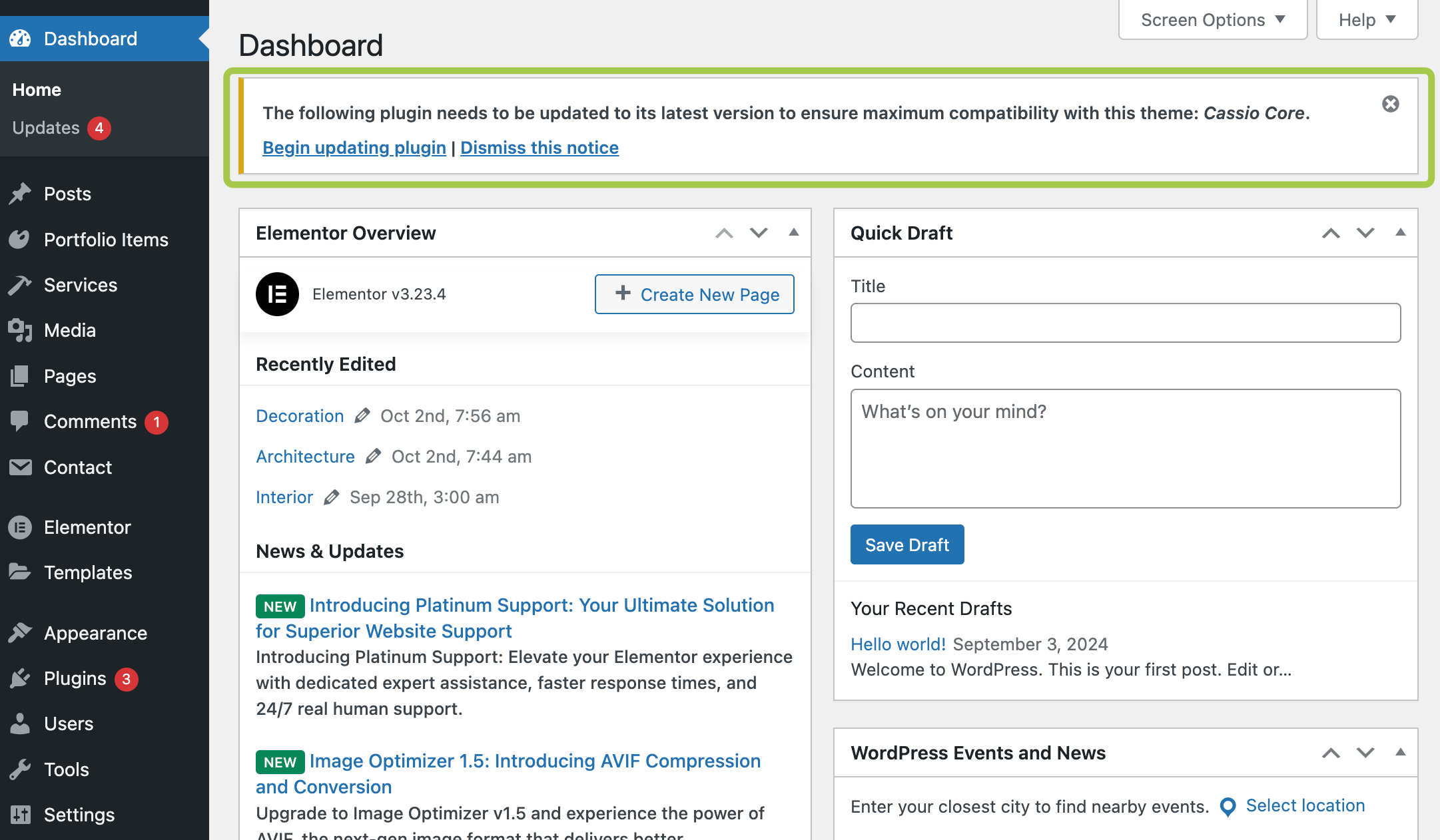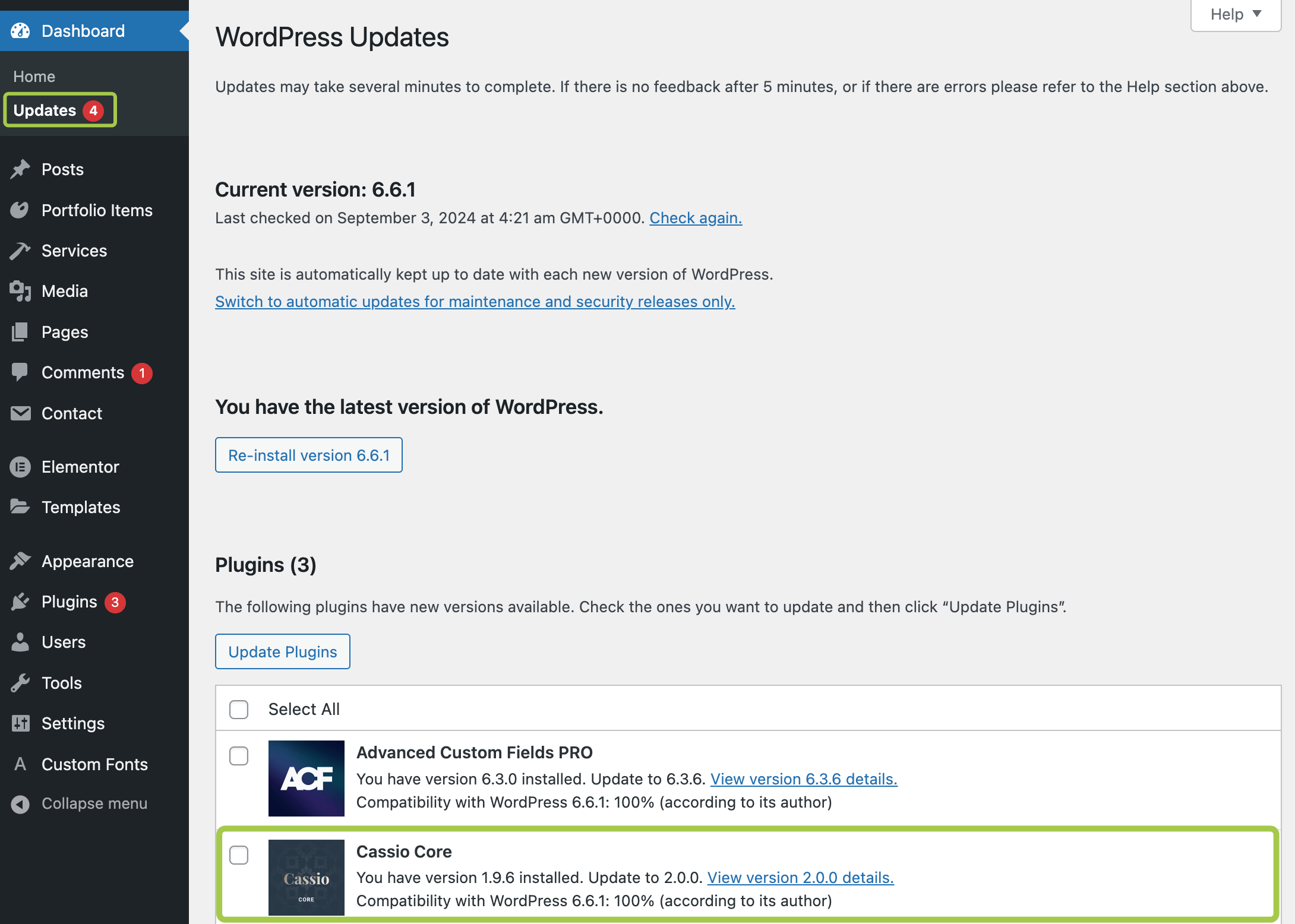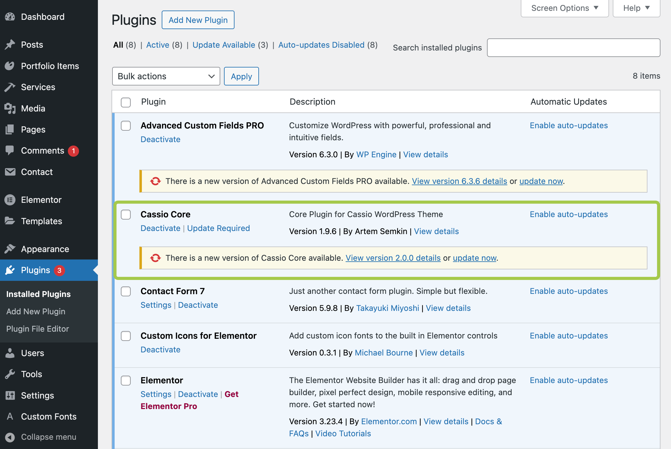 From time to time (or right after a theme update in some cases), you'll get a reminder to update Cassio Core Plugin. The reminder could look like this: