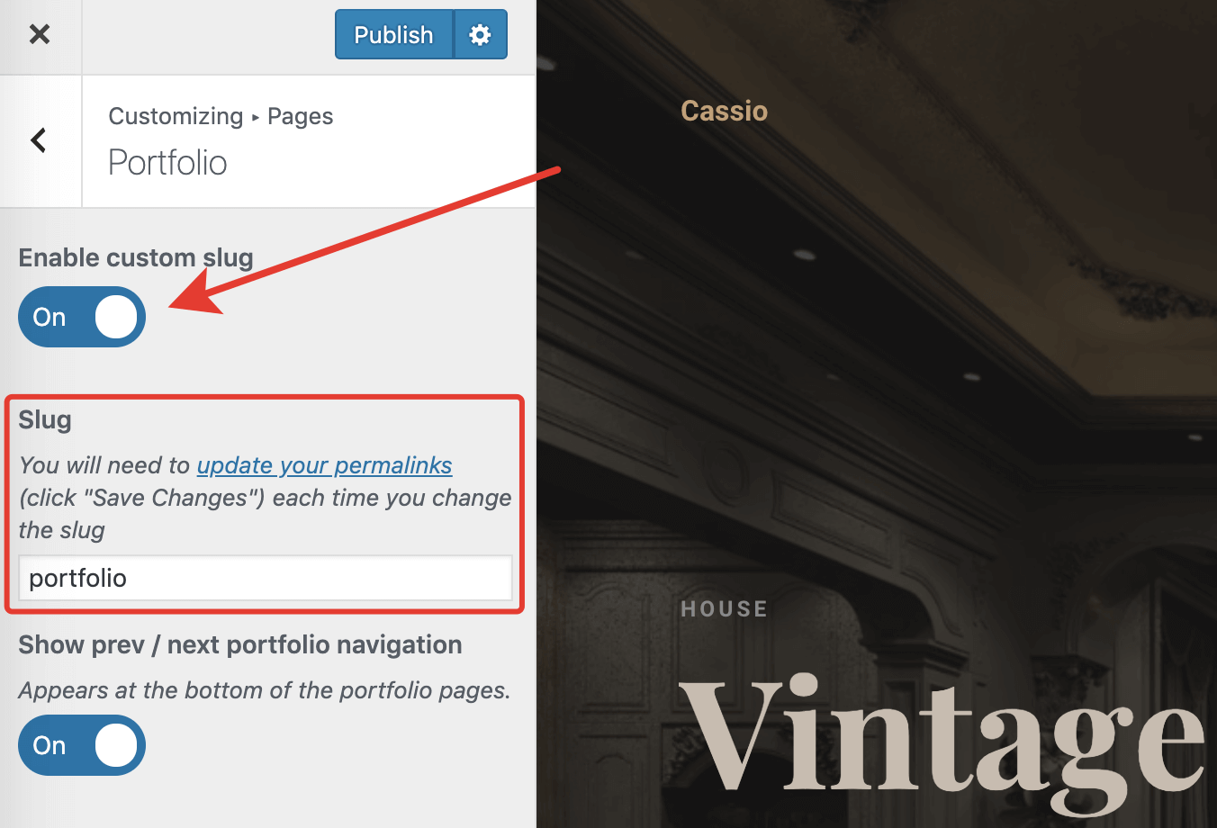 If you'd like to change these slugs, go to Customizer → Pages → Portfolio/Services. Enable the custom slug option here, and you will see a text field for custom slug input. Change it as you prefer and click Update in the Customizer.