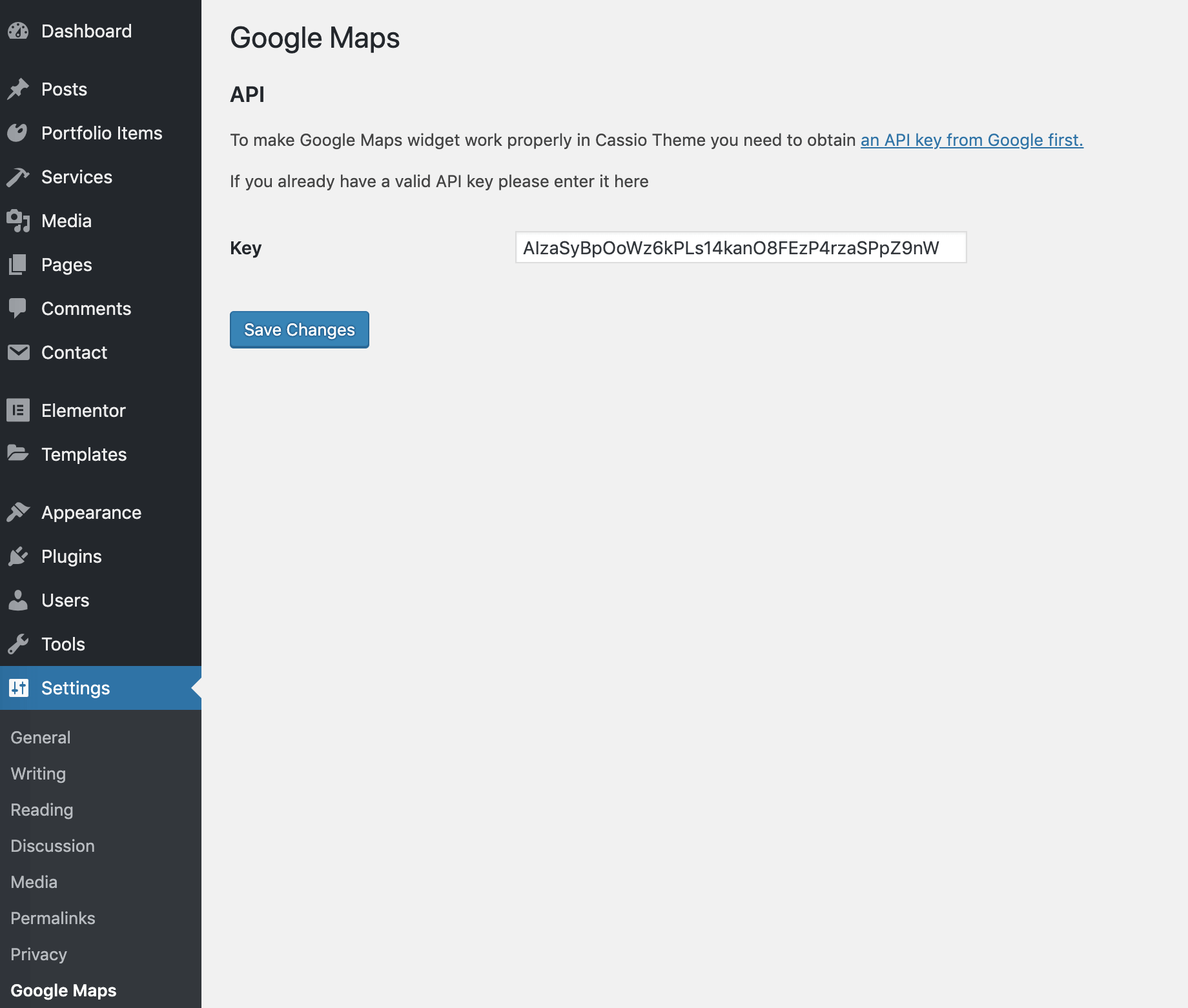 Paste your API key that you’ve got from Google Cloud (opens new window) and click the Save Changes button.