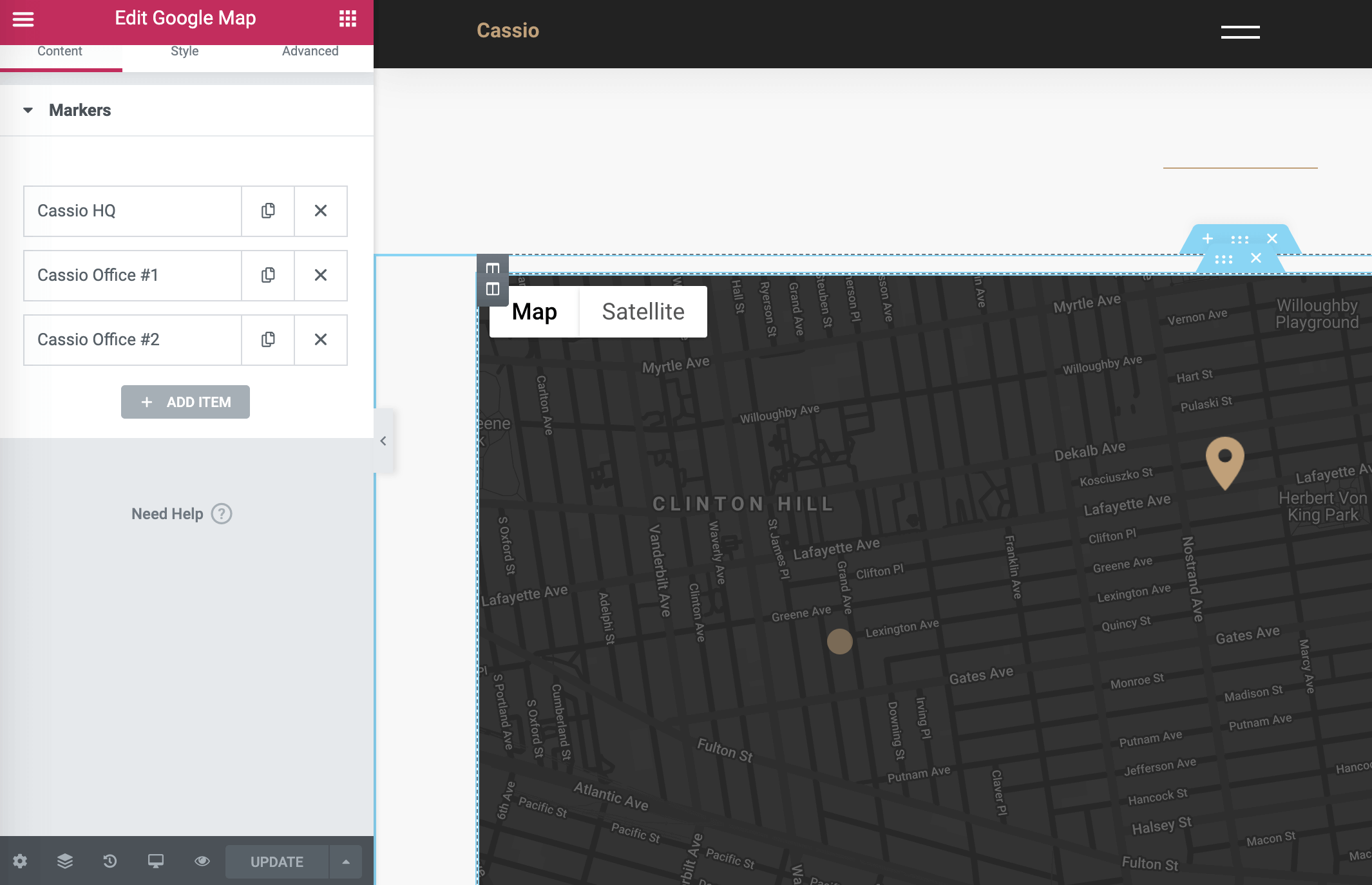 Cassio comes with an Elementor widget based on Google Map with many customization options. Before you can use it, you need to obtain a correct API key from Google Cloud (opens new window). Google now requires a credit card to use their map API (even if you don’t have a lot of visitors which load their server anyway).