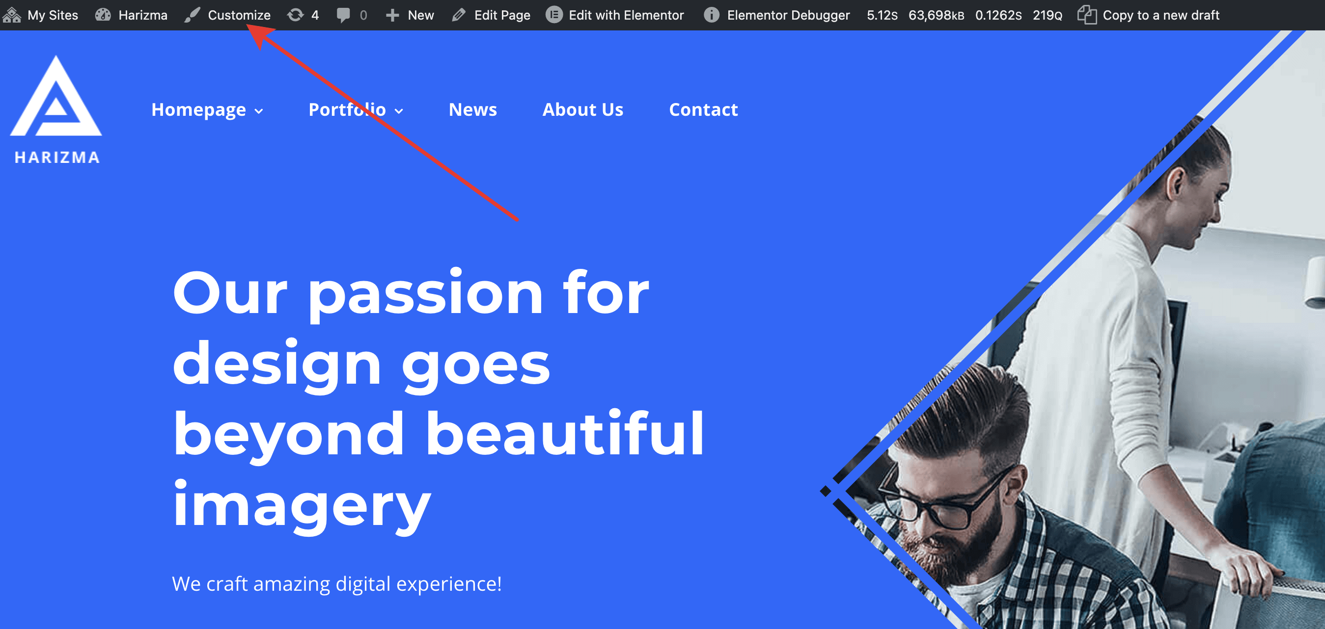 The theme is seamlessly integrated with the standard WordPress Customizer. It’s a useful panel that you can find when exploring your website frontend while being logged in as an administrator. All the theme visual options like typography, colors, logo, etc., are located in the WordPress Customizer. Let’s see how to access it.