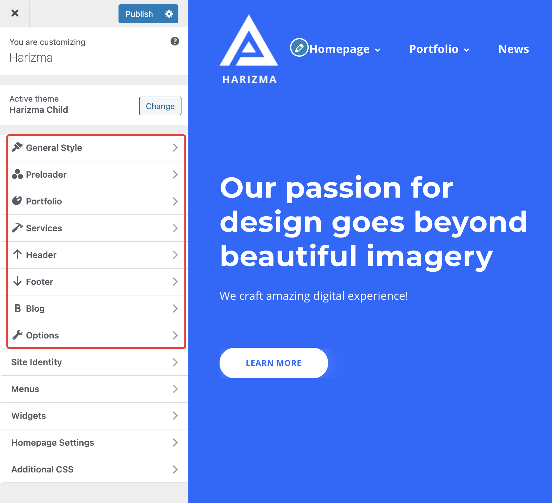 There are many more options in the customizer that the theme supports. Just explore and play around with all these options. You can preview any changes in real-time before saving.