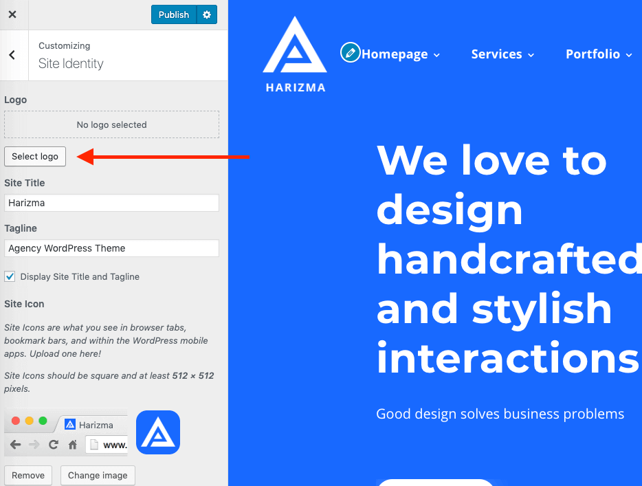 To upload your logo, go to Customizer → Site Identity. You can use the standard text logo version (with or without a tagline) or upload your own brand image.