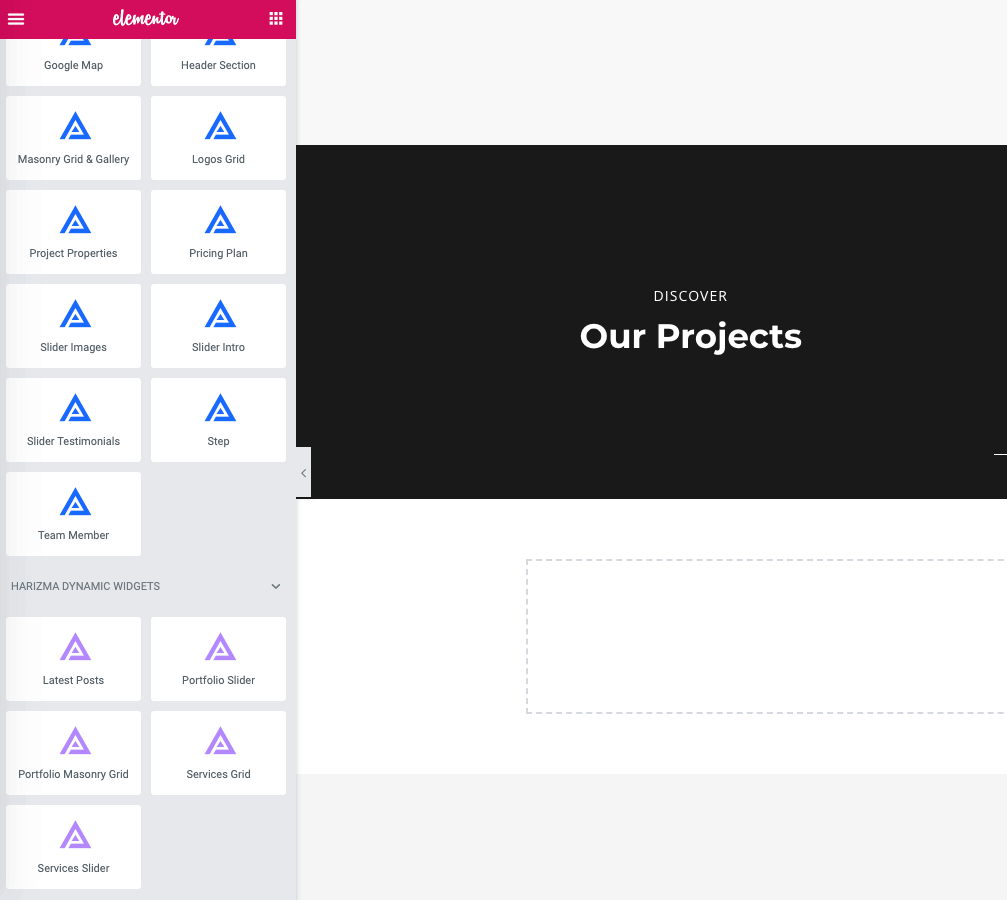 Click on the Grid icon in the left panel. You will see all the available widgets you can place on the page. When the Harizma Core Plugin is active (required by the theme), you will see two extra sections in the Elementor widget panel – Harizma Static Widgets and Harizma Dynamic Widgets.