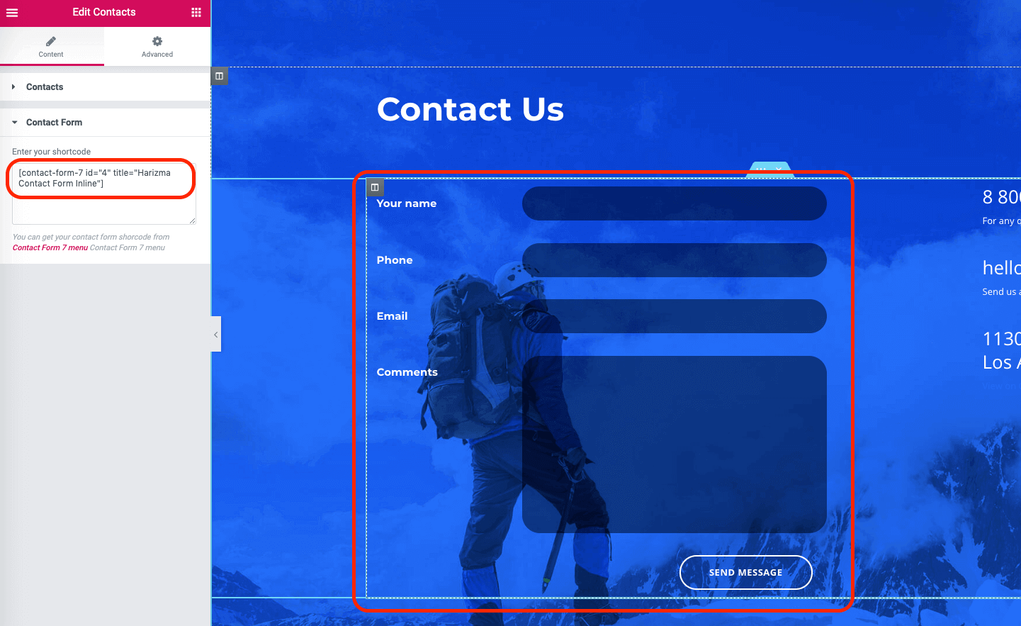 Now copy one of those shortcodes and edit a page with Elementor where you want to place your contact form. You can use the Google Map or Contacts widgets provided by the theme in Elementor editing mode. Paste the shortcode that you copied from the 1st step. You should see your form rendered immediately.