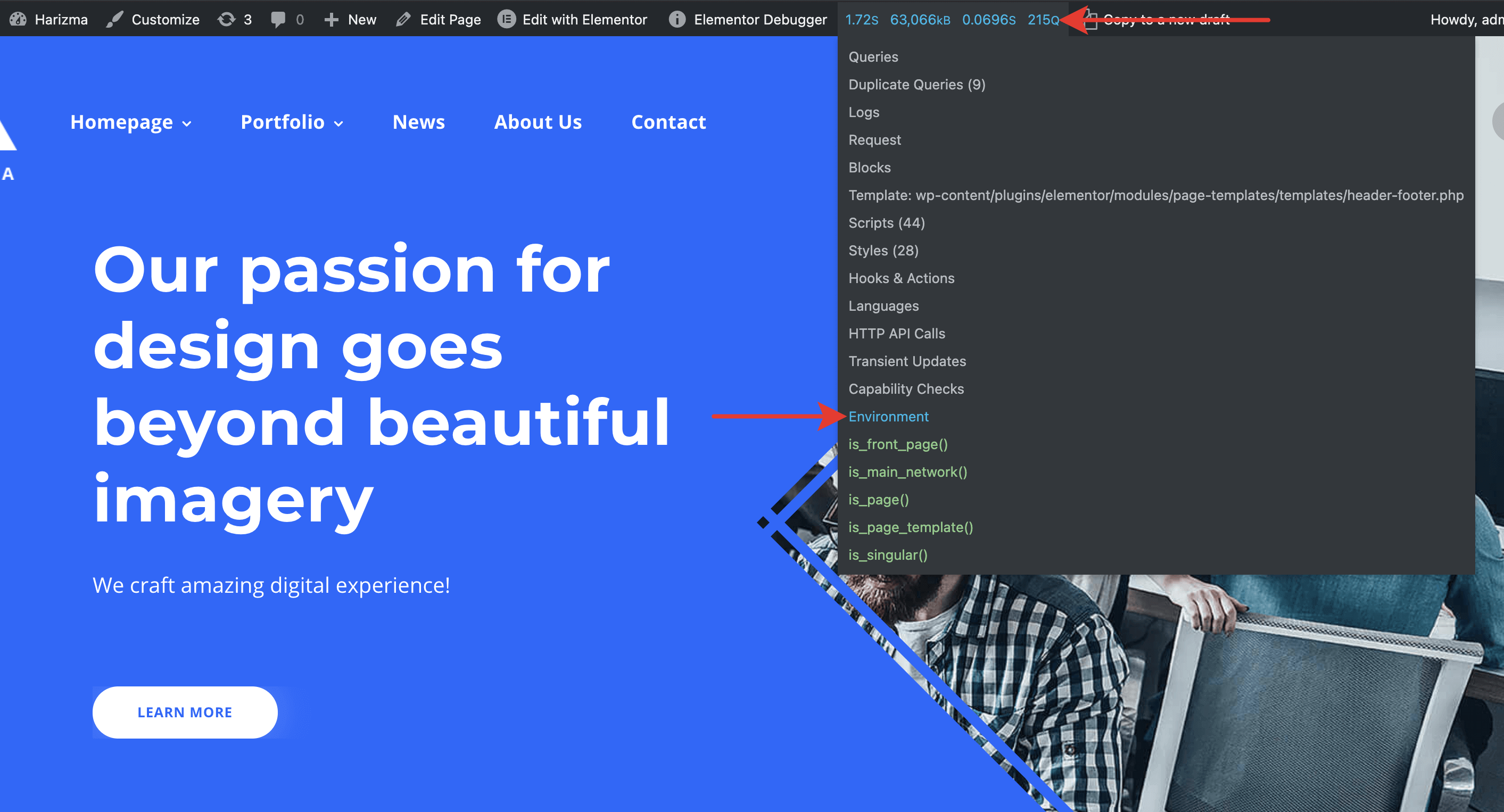 Once Query Monitor (opens new window) is installed and activated, go to your site frontend. You should see a new item in the admin bar. It may show Query Monitor, QM, or some network statistics.