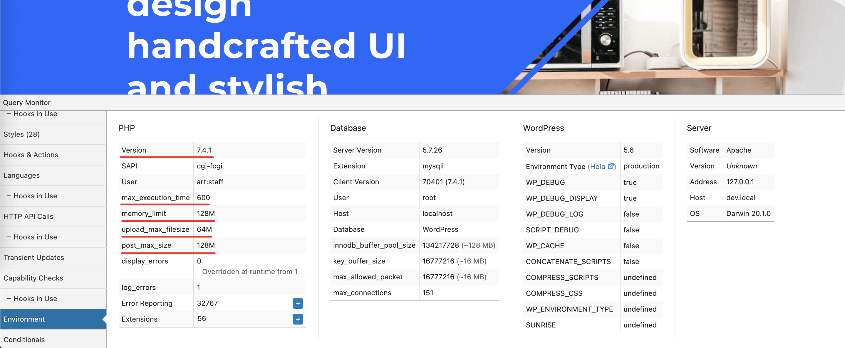 EnvironmentIn the opened bottom panel, double-check all the key numbers. If your server has low configuration limits, please contact your hosting provider and ask them to increase those. You can also check your actual PHP version from this panel. More information related to recommended PHP limits can be found in the Server Requirements section.