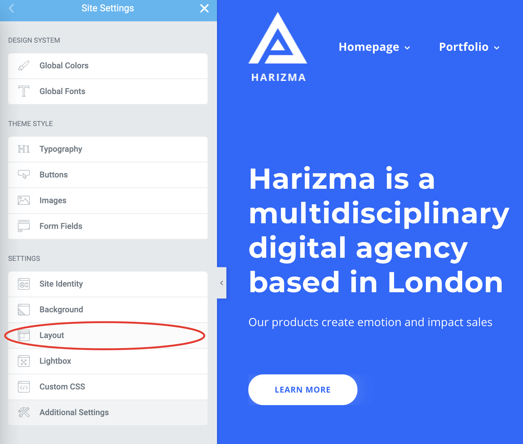 Layout panel under the Settings panels group