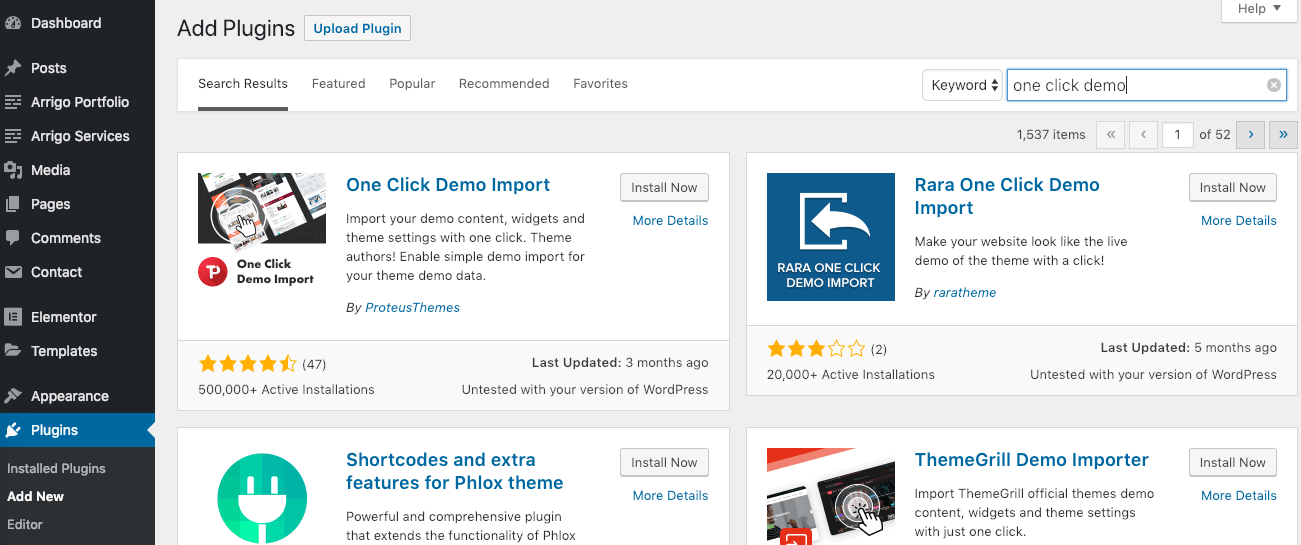 Let’s manually install a plugin for the hassle-free demo import. It’s called One Click Demo Import (opens new window) and it's available for download from the official WordPress plugins repository.