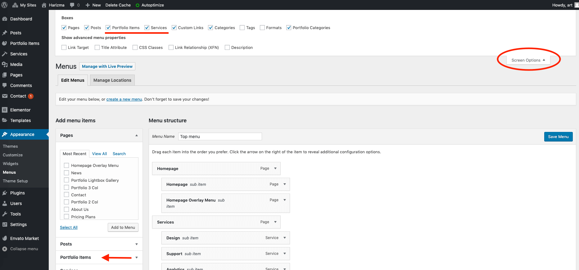 To set up the navigation menu, go to Appearance → Menu in the admin panel. Then open Screen Options and enable the post types that you want to include in your menu later. The Harizma Core plugin registers two extra custom post types: Portfolio and Services.