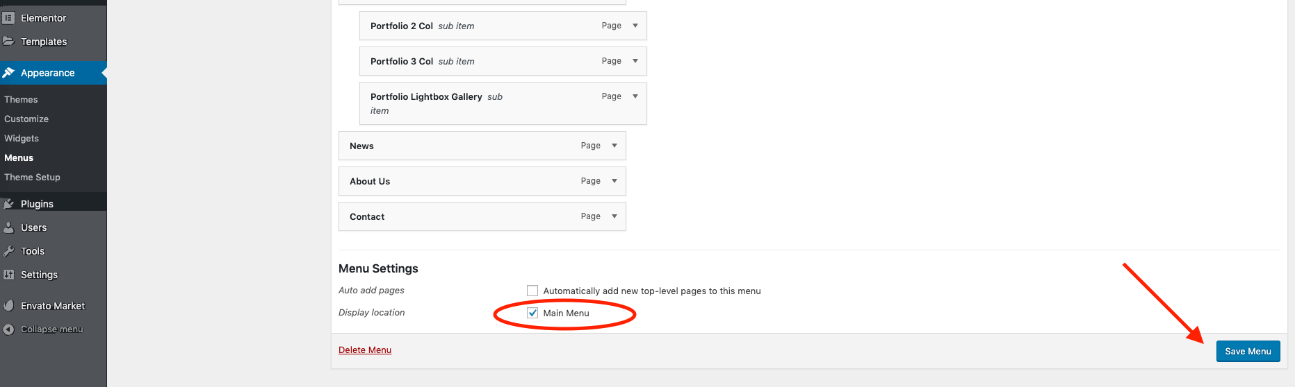 You can drag and drop links to your pages and posts into the menu. It is also possible to create a link with a custom URL. Once you’re done, make sure that the menu you've edited is added to the Main Menu location.