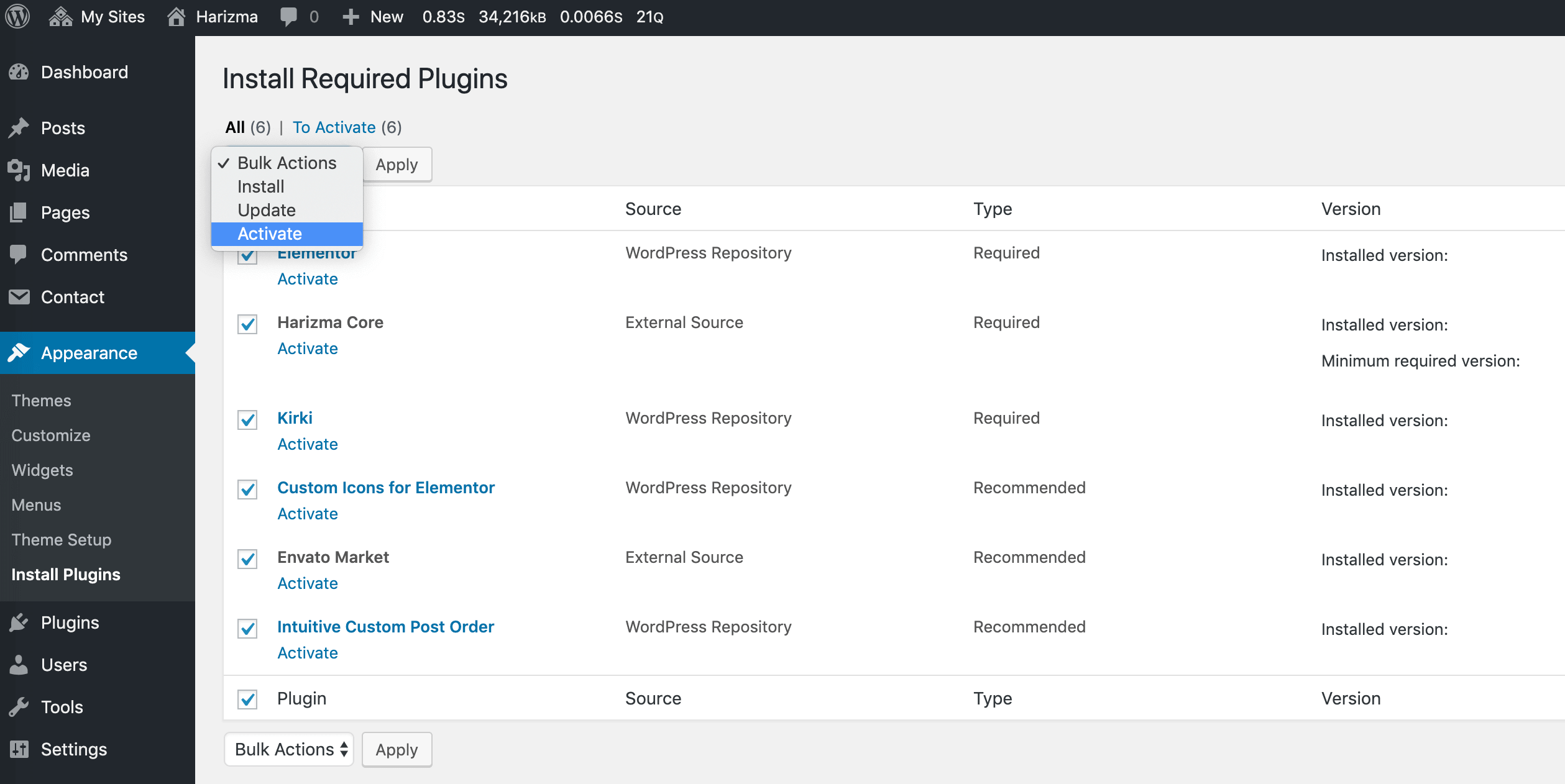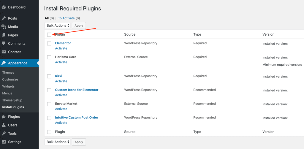 Click on the Bulk Actions dropdown, select Activate, and click Apply.