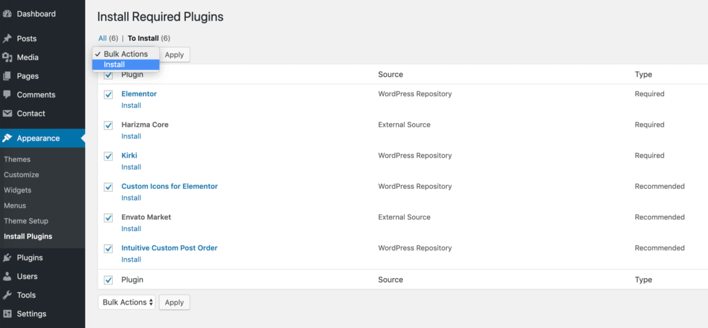 Select all the plugins to be installed by clicking the top checkbox, then choose Install from the dropdown menu. Wait until all the plugins are downloaded and installed.