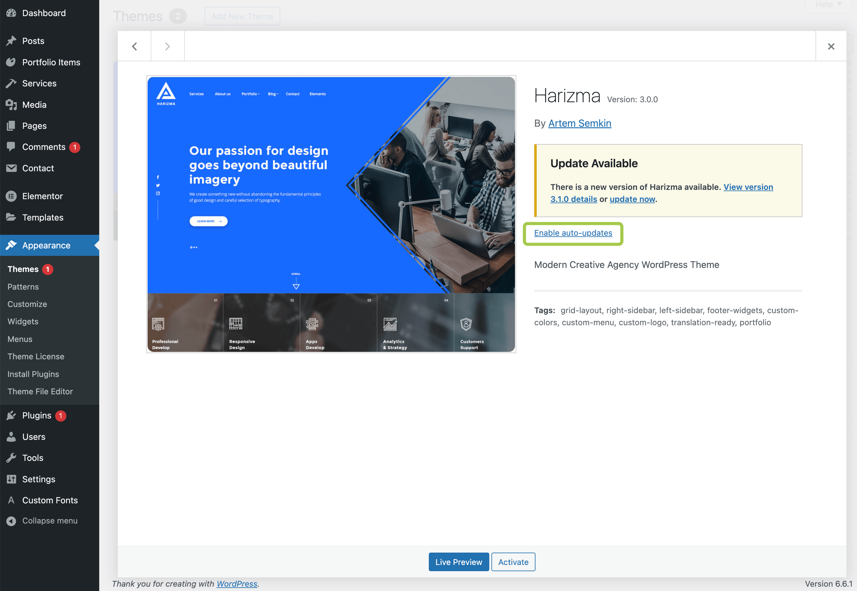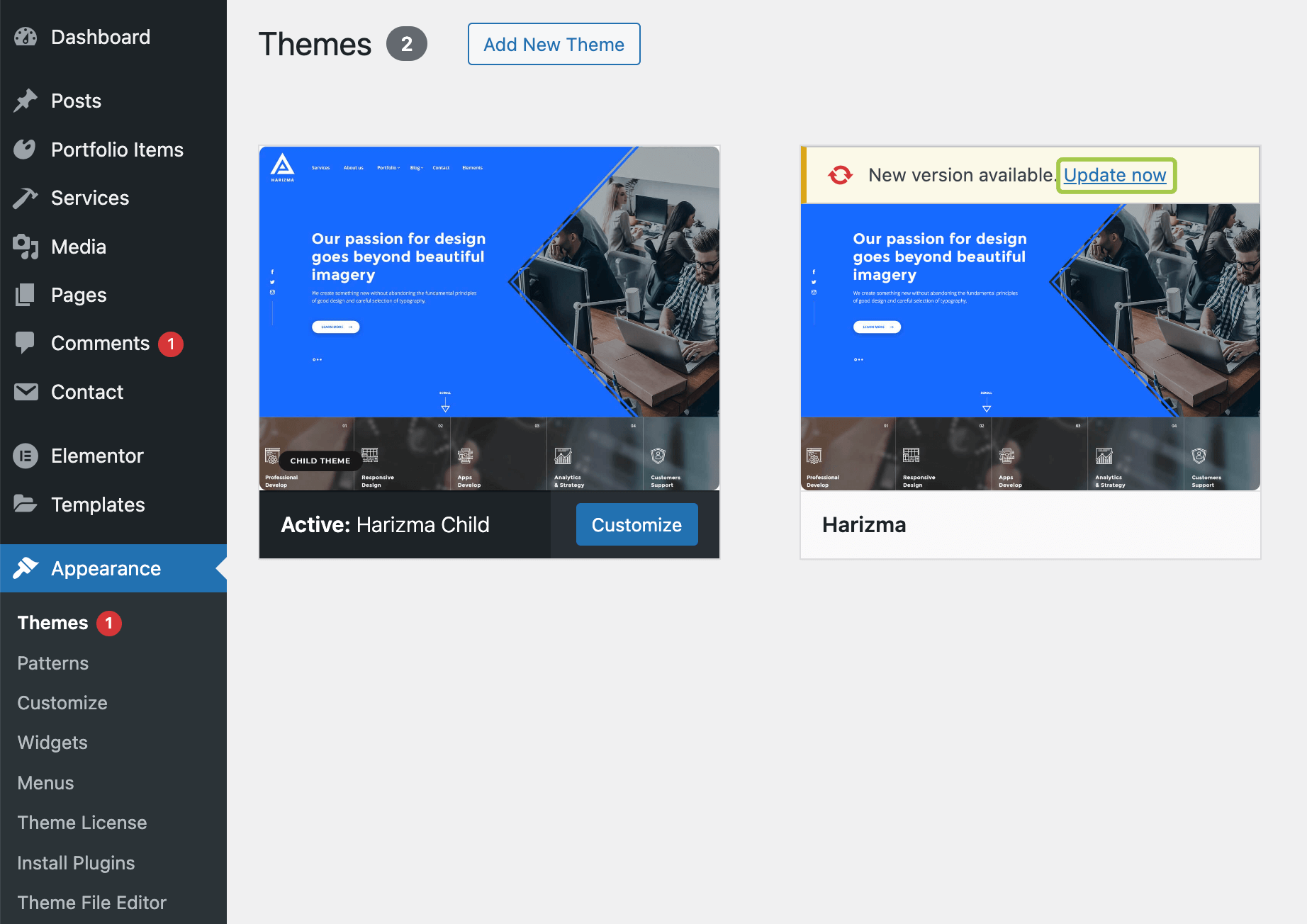 Once the license is activated, you'll receive notifications for theme updates directly in your WordPress panel: