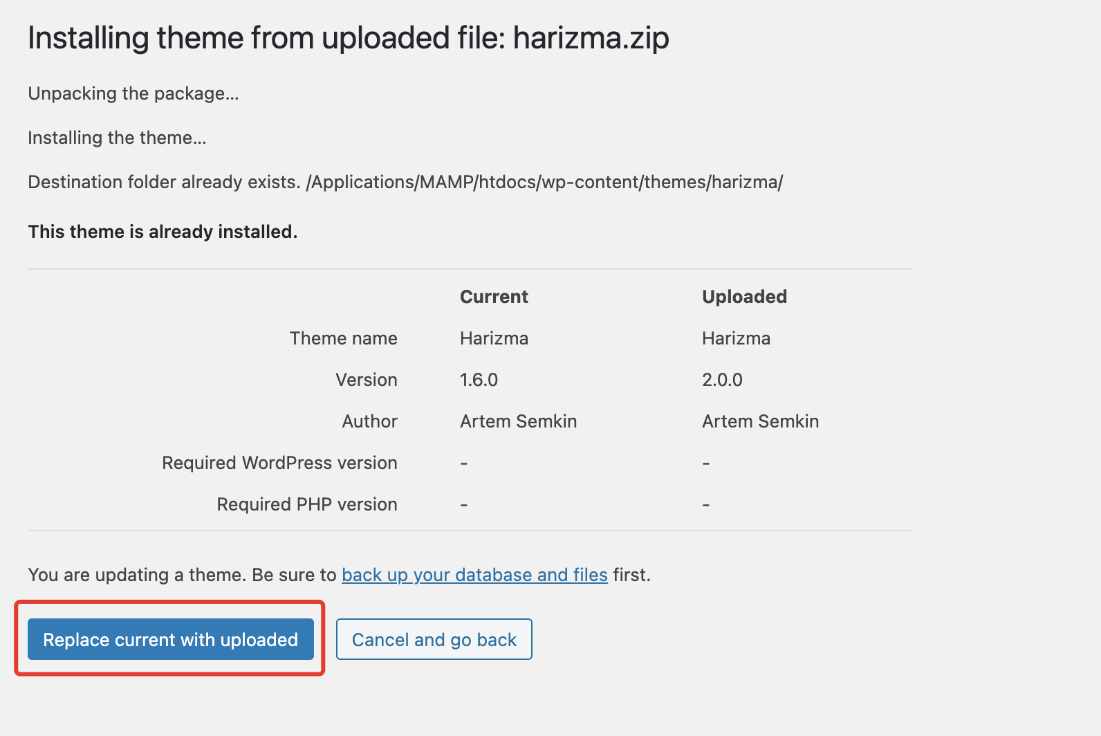 You'll be notified that a theme with the same name already exists. Click Replace current with uploaded to finish the update process.