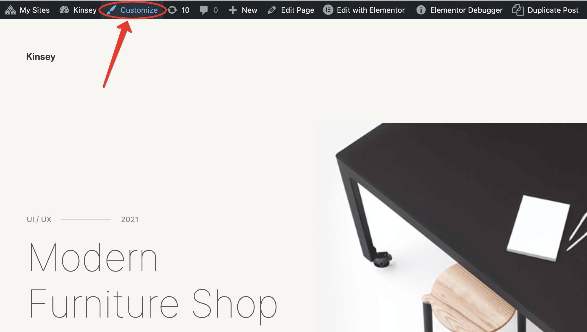 The Kinsey theme is seamlessly integrated with the standard WordPress Customizer. The Customizer is a useful panel that you can find when exploring your website frontend while being logged in as an administrator. All the theme's visual options, such as typography, colors, logo, etc., are located in the WordPress Customizer. Let’s see how to access it.