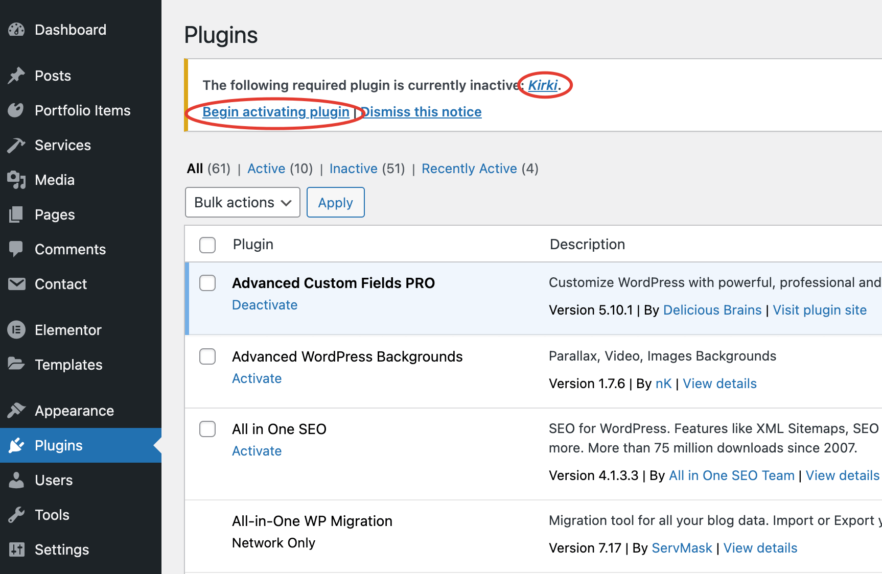 If you don’t have those additional theme panels like in the screenshot above, please check if you have the Kirki Plugin (opens new window) installed and activated. It’s required by the theme and is responsible for extending the WordPress Customizer panel.
