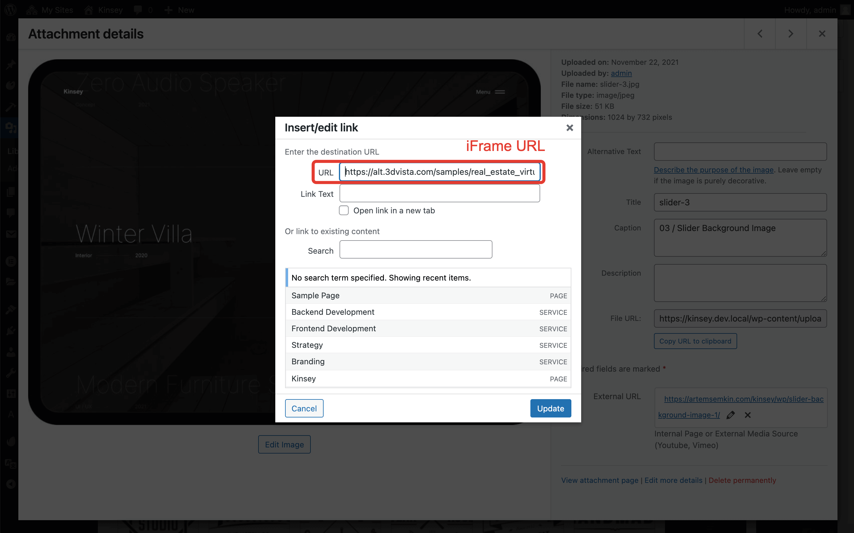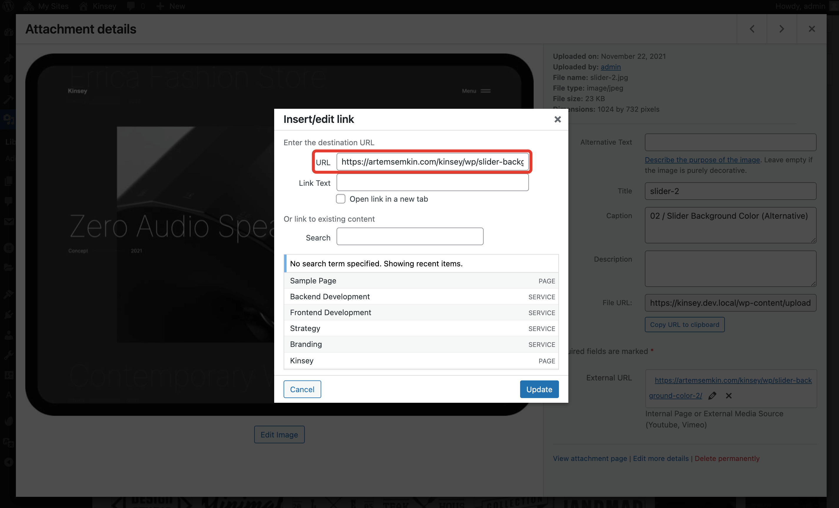 The Kinsey theme extends the images attachments panel with an additional field named External URL.