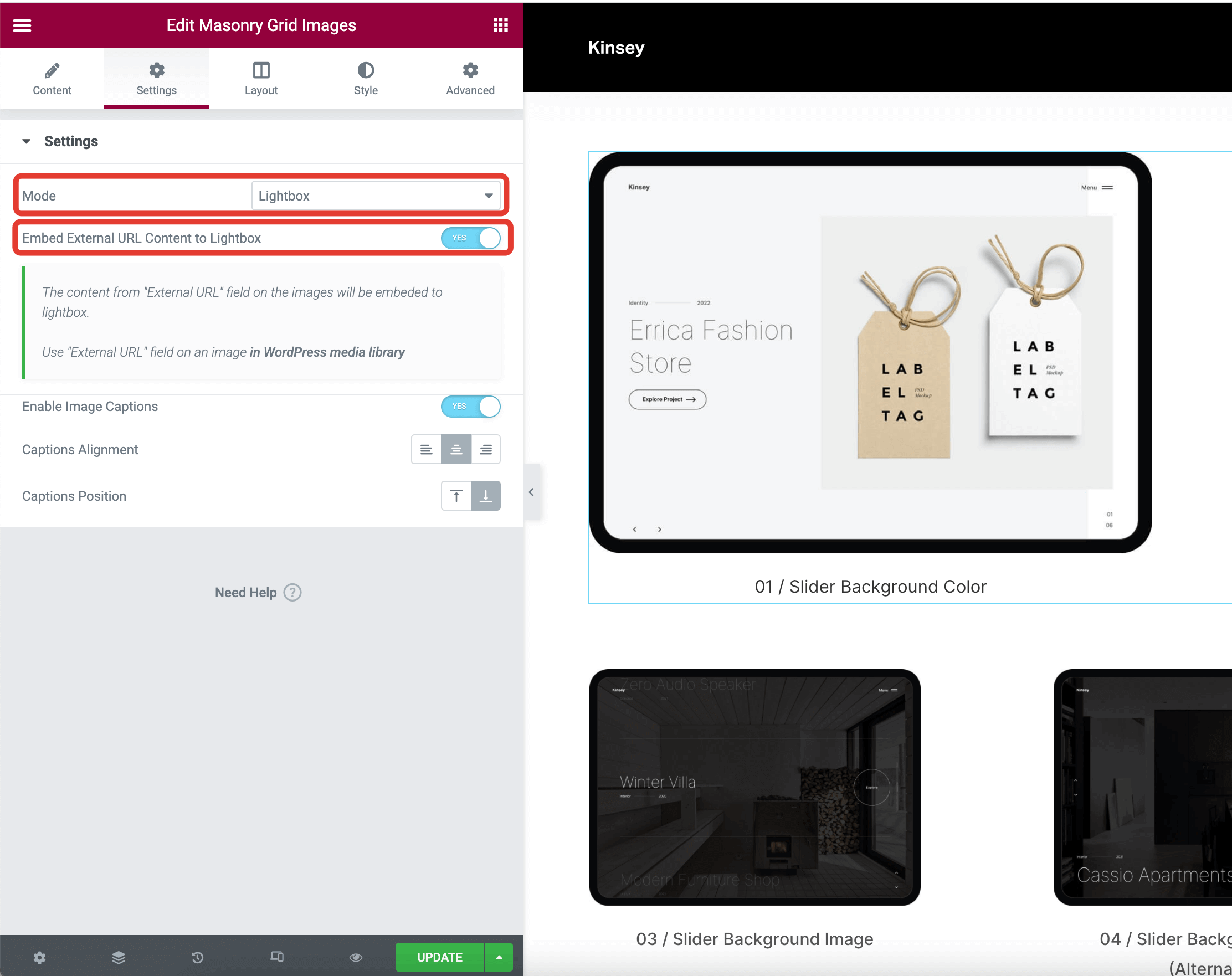 By default, the theme's Masonry Grid Elementor widget opens a lightbox with the full-size images. You can change this behavior under the Settings tab in the widget options.