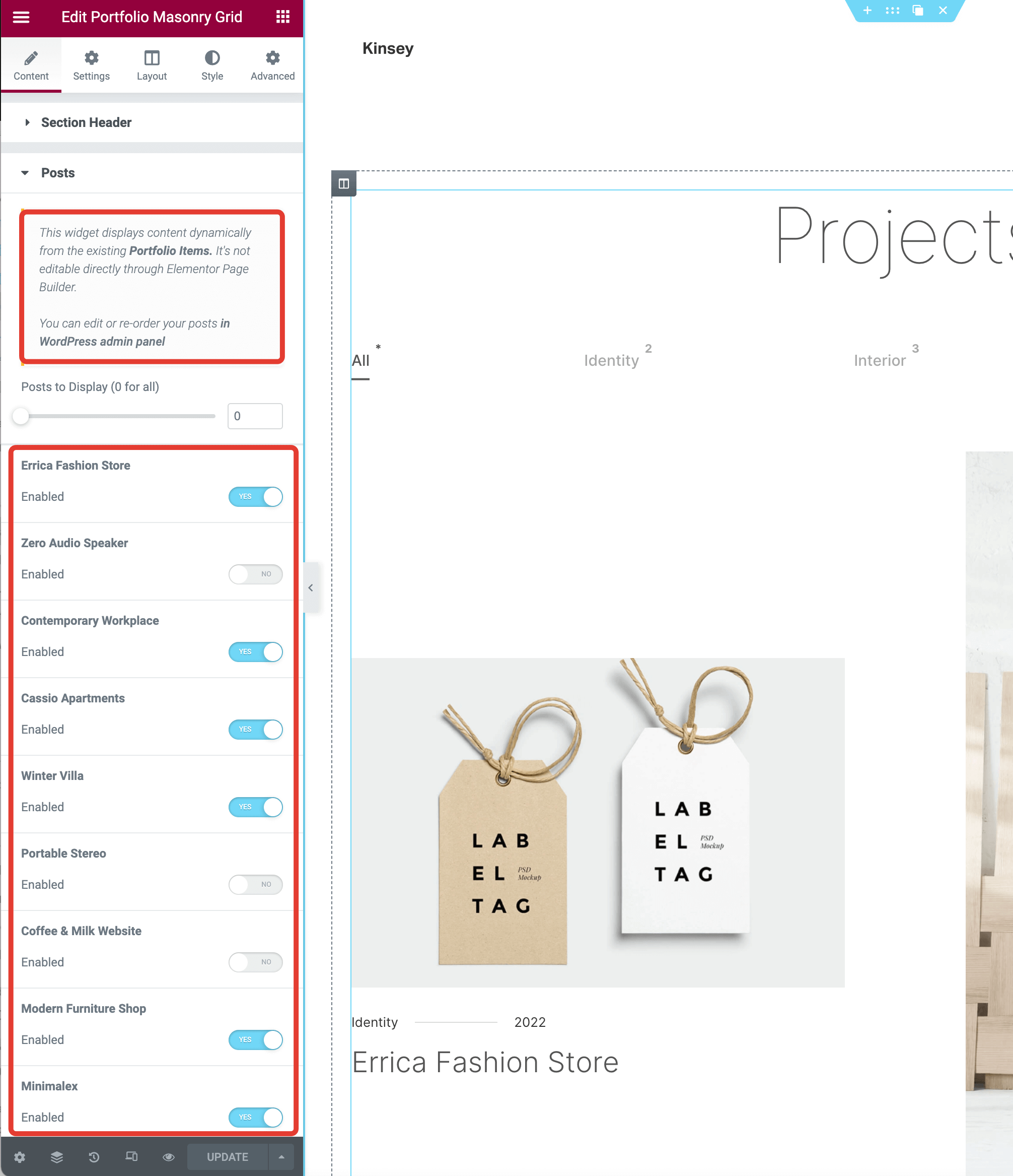 Consider the next example. Portfolio Masonry Grid widget pulls content dynamically from theme Portfolio Item custom post type. Editing options are far limited, for example, you can’t edit the portfolio headings from here.