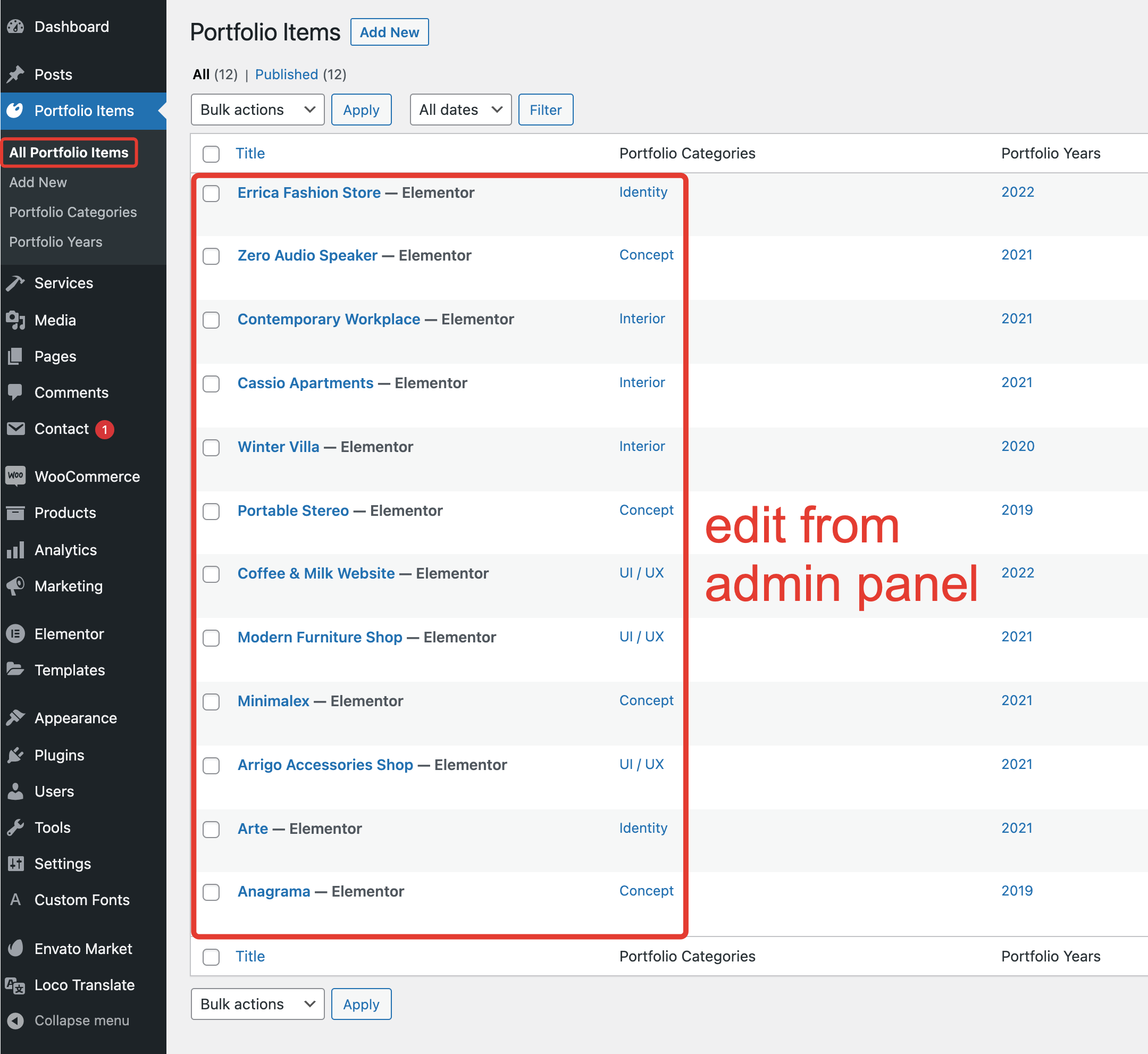 To edit portfolio items, you need to go into Admin Panel → Portfolio Items.