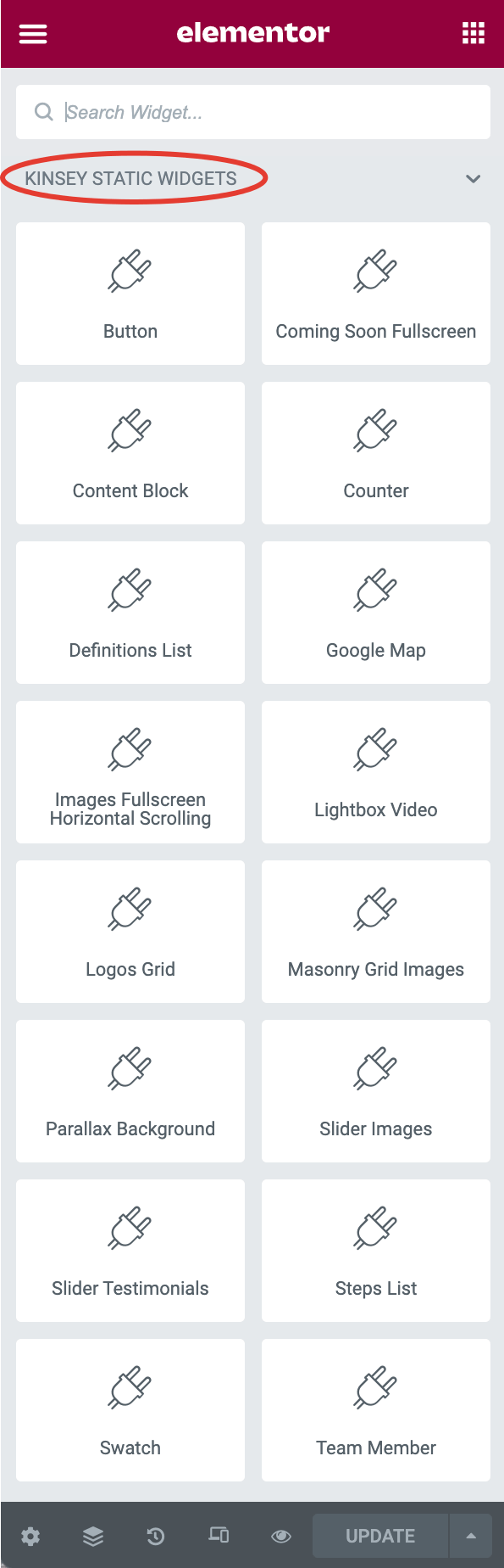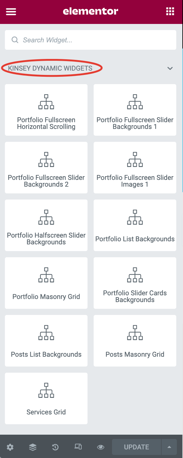 Kinsey comes with custom carefully crafted widgets which you can easily use during the page building. If you scroll down widgets panel, you will see Kinsey widgets sections. But before using them, let me explain what Static and Dynamic widgets are.
